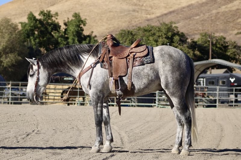 ONLINE AUCTION Place your bids at www.PlatinumEquineAuction.com Starting Bid $3500 Auction ends November 10th, 2024 Need a new saddle? Check out White Rock Saddles on our website or Facebook! Jorje is an amazing dapple gray mustang gelding is the epitome of gentle, standing at a proud 16 hands and exuding kindness with every movement. Jorje gracefully conquers the steepest hills and navigates rocky terrain with ease, embodying both strength and elegance. Renowned for his extreme gentleness, he is safe for absolutely anyone to ride, making him a prized companion in any equestrian setting. Not only has he gathered and branded countless cattle with unwavering dedication, but this exceptional horse also showcases his talents as a proven seasoned head horse. Solid in the box, he pulls like a dream and faces on a dime; whether you’re running ten or twenty head in succession, he rates cattle impeccably while delivering consistent shots each time. Jorje accolades include winning jackpots, buckles, and substantial prize money—a testament to his competitive spirit evident during events such as the Californian ACTRA roping finals where he performed rock solidly as always. Ridden by participants ranging from novice to advanced riders alike, he remains adaptable and competitive across all skill levels. Jorje has also been started English, he shows remarkable potential to be shown in the hunter jumper, or dressage. Beyond his athletic prowess—he clips easily, ties without fussiness, is cooperative for the farrier—all while possessing an amiable personality that makes him simply delightful to be around. This gelding exhibits absolute comfort around tarps, balls, or traffic; truly superior traits make him an unparalleled trail partner, Jorje is a true “one in a million” among horses today because they don’t make them like this often anymore! Don’t miss out on a great opportunity to own part of American history. Located in King City, CA. Beau Mendala 831-732-9074. ONLINE AUCTION Place your bids at www.PlatinumEquineAuction.com Starting Bid $3500 Auction ends November 10th, 2024 Need a new saddle? Check out White Rock Saddles on our website or Facebook!