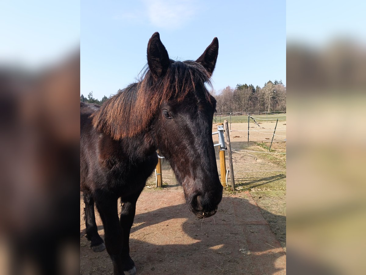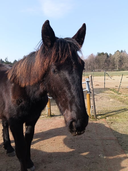 Pure black Noriker stallion. He has a wonderful presence, is affectionate, and learns quickly and eagerly. He is accustomed to having his hooves picked out, is familiar with cars, tractors, and children, and can be led without any issues. He also has some groundwork experience.