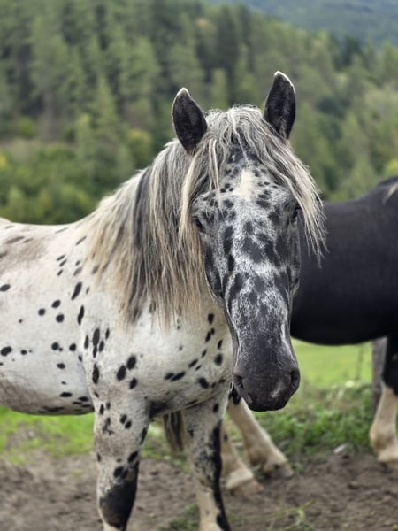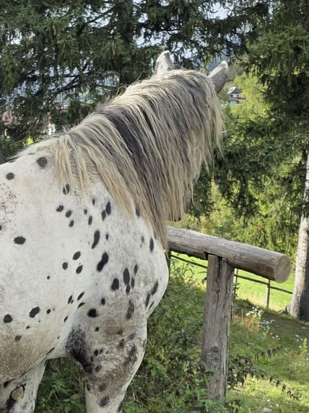 Jury Elmar, sired by Jumbo Elmar and Maike (HM) out of Focus Elmar, is a stunning young Noriker stallion born on March 27, 2023. He boasts the coveted and rare tiger coloring with beautiful markings. Jury is free from PSSM, vaccinated (against influenza and tetanus), and regularly dewormed. He is calm and well-behaved when handled by the farrier (has already been shod) and loads without any issues. He has always been kept with peers, demonstrating a very friendly and sociable nature. He is also comfortable being alone. Jury has not yet been backed or started under saddle. I wish for him to find a home where he can continue to be supported and developed according to his age. He is being offered due to downsizing. Jury will surely become a wonderful leisure horse for riding or driving sports. He has gained the necessary sure-footedness on the mountain pasture. Anyone dreaming of a black-spotted tiger Noriker is welcome to contact me. As time is very precious, I kindly ask only serious inquiries. Thank you.
