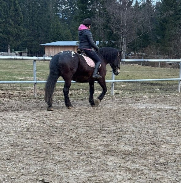 We are looking for a suitable permanent home for our 6-year-old Noriker gelding, Ramiro. Ramiro is a striking horse in the rare liver-tiger coloring. He has had a calm upbringing and was recently started under saddle with gentle groundwork. As a result, he has a solid foundation and is motivated and eager to learn during training sessions. Whether in the field in a group, during ground work, or at clinics such as Working Equitation – he participates well everywhere and consistently shows attentiveness and good manners. Ramiro is not a beginner’s horse and requires a rider who can provide him with confidence and security. With proper guidance, he will develop into a reliable partner. In daily handling, he is straightforward: he is easy to load, familiar with everyday routines and outings, and currently lives in a pasture turnout with a mixed herd, where he gets along very well with others. He has also traveled to competitions and remained calm and relaxed throughout. He is currently shod in front. Ramiro is a young horse with a good foundation, ready to be further developed and promoted. We will only place him in responsible and suitable hands.