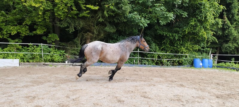 With a heavy heart, I must part with my Noriker mix Rudi, as I can no longer do him justice. When riding, Rudi is very well-behaved and proper, goes through all three gaits without any issues, and can also be ridden by children. On the ground, he tends to test boundaries more often, so he needs a consistent but fair hand in that regard. He has been ridden in the riding arena and out on trails, and with his previous owner, he was also hitched to a carriage.