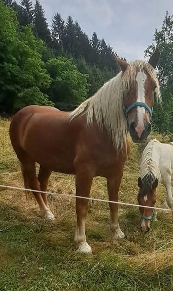 Zeus is an impressive, well-built Noriker gelding with a calm and balanced temperament. He is very friendly, attentive, and reliable. He is accustomed to being handled by the farrier and veterinarian, walks calmly on a lead, and has already been backed. Thanks to his steady nature and majestic appearance, he is a real eye-catcher and ideal for enthusiasts of strong draft horses. For serious inquiries, please feel free to contact me for more information or videos via message.