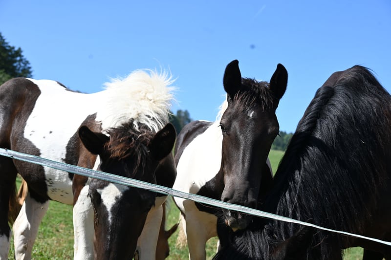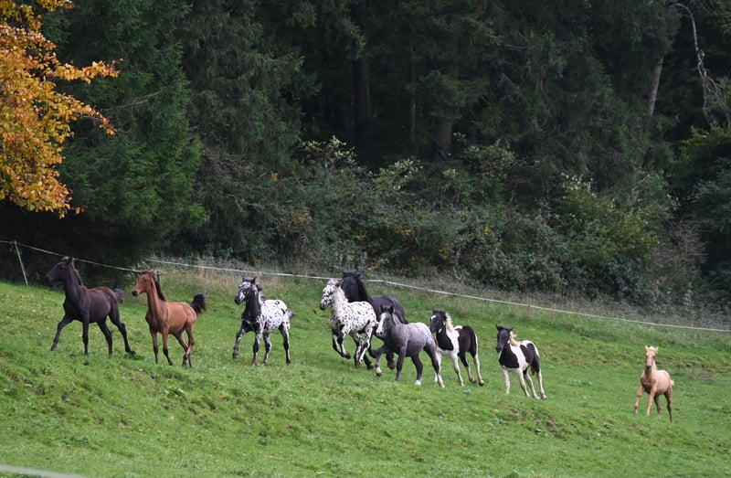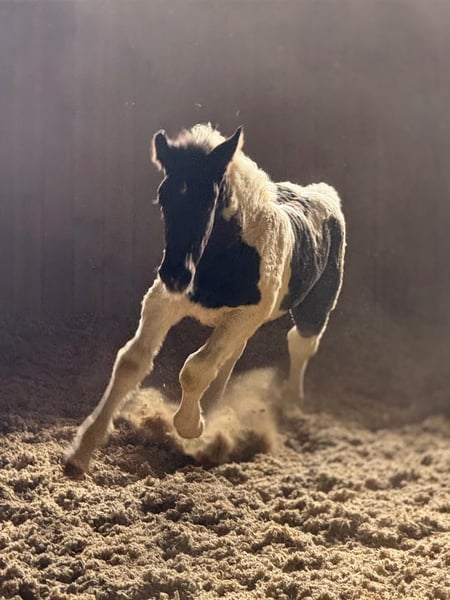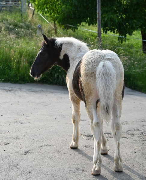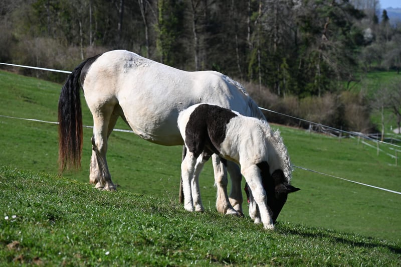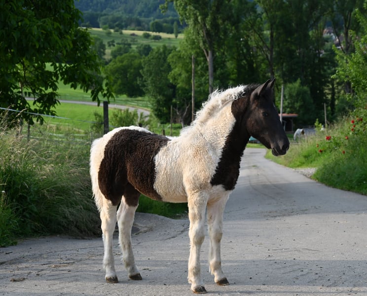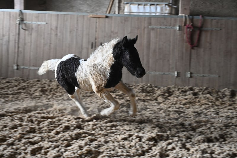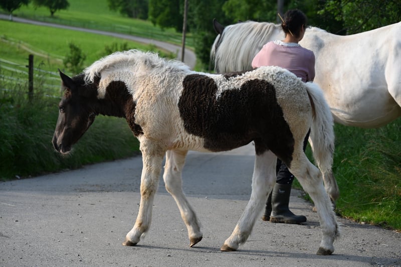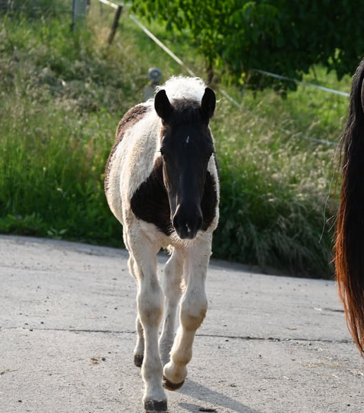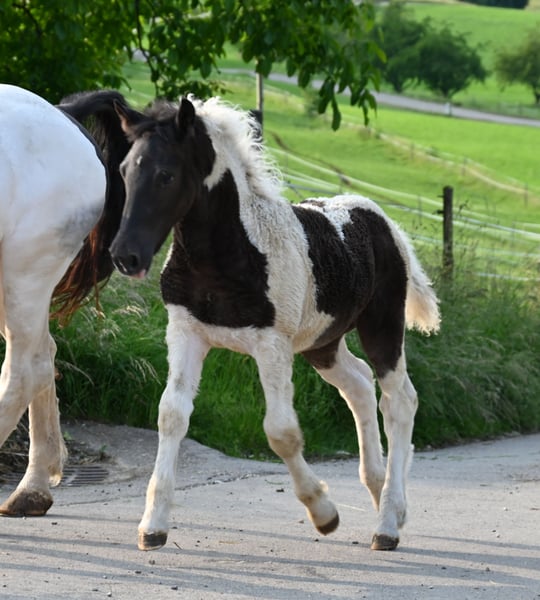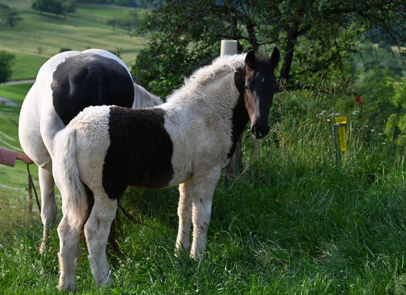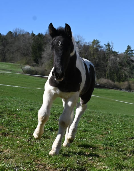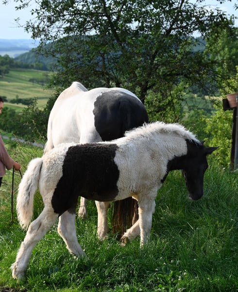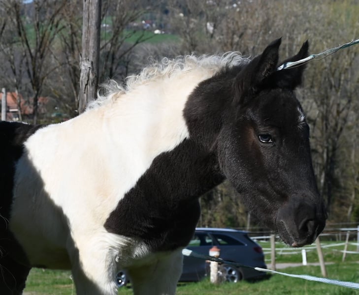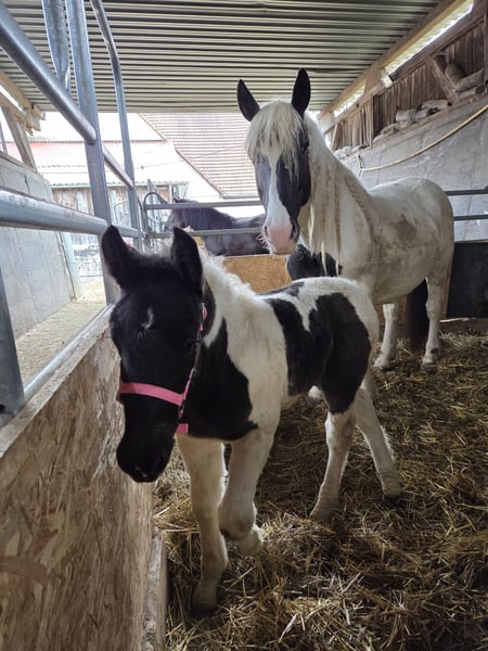 Jade Kubny was born on February 27, 2025. She is a black-spotted Noriker filly. She will be available for adoption starting in early September and can be reserved now. I have had a DNA test done, and she will pass on her color 75% of the time. Jade will be sold with a well-handled foal ABC and will be dewormed multiple times over the next 6 months. Jade is PSSM1 free. Her mother, Jasmina, has been entered into the studbook as a breeding mare with a score of 7.50. Her father, Hennessy Schaunitz, is licensed with a score of 7.73 and is a beautiful Noriker stallion. Jade is expected to grow between 160-164 cm. We have alpacas, dogs, children, cattle, chickens, cats, and farm machinery in our stable, which she will become familiar with. Jade is very curious, playful, and friendly. Sire: Hennessy Schaunitz Dam's Sire: Firon Elmar via Lotto Vulkan