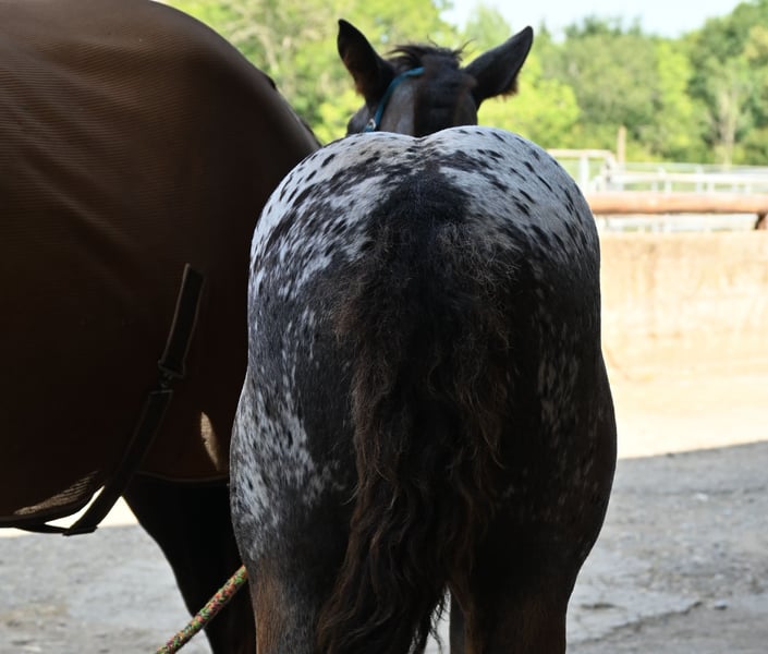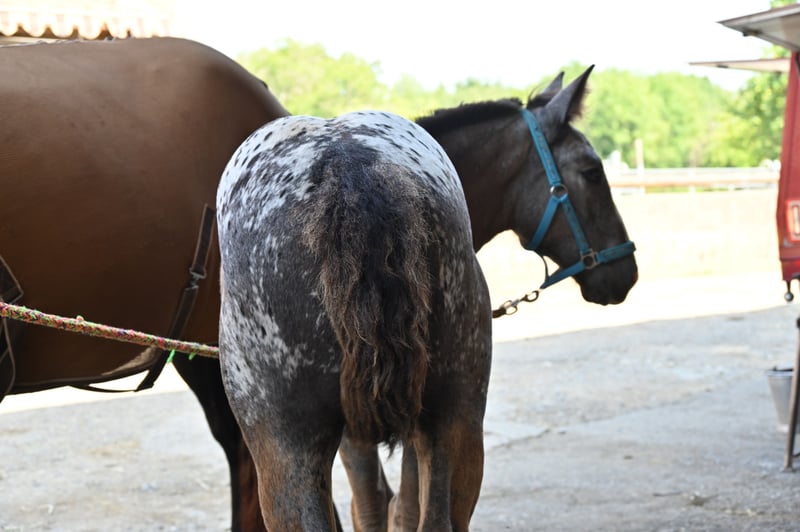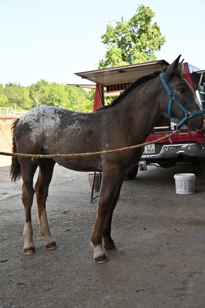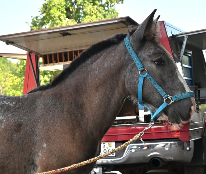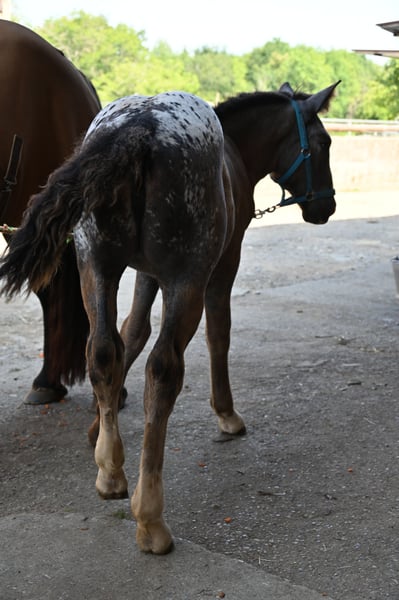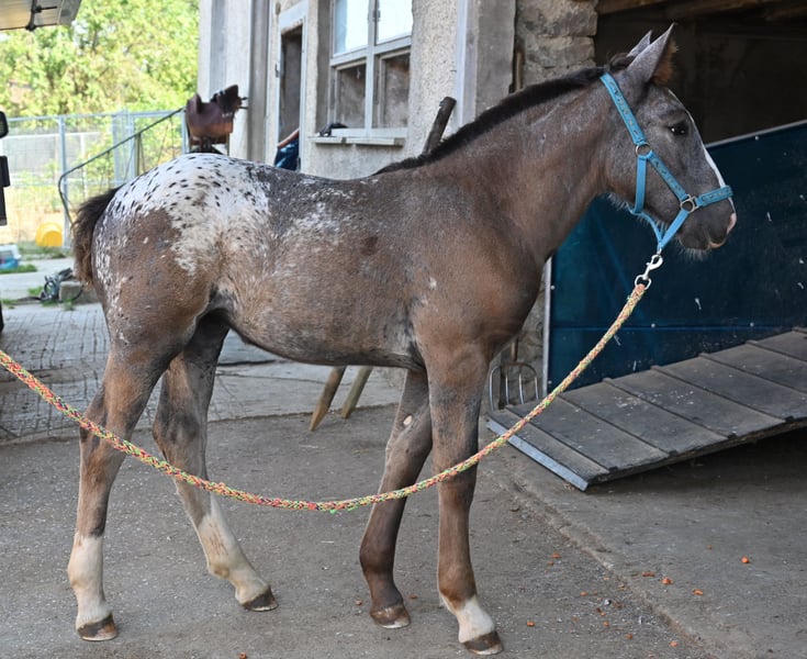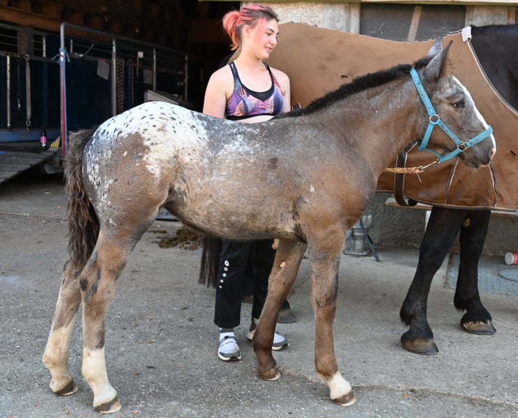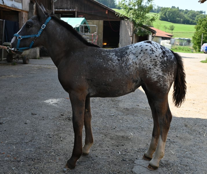 Starlight Kubny is a very pretty, correct Noriker Schabracktiger mare who will continue to develop her tiger markings; she has not yet reached her final color. Everything that is currently gray will turn white, and she has spots up to her withers. Starlight is a very friendly and gentle foal with a strong build, and just like her mother, she is very resilient and fearless. She is expected to grow to about 161-164 cm. Her father is Fragolino Elmar, who was licensed with a score of 7.64 points and completed the stallion performance test as the reserve winner with an index of 123.35. The mother, Samira, was entered into the studbook as a mare with a score of 7.64 points and successfully completed the performance test with a score of 7.67 points. Samira has an exceptionally high-quality pedigree. Her father is Taiga Vulkan, who won the stallion performance test in 2005 with an index of 133.04 and was awarded as an elite stallion for particularly successful offspring. He is a descendant of the 1b stallion Taifun Vulkan XIV. Sabrina is the mother of Samira; she was entered into the studbook with a score of 7.91 and is a descendant of Schitter Vulkan, while the grandmother is also a 1b state premium mare, Senat. The entire pedigree is excellent. Starlight will stay with her mother until November. After that, she may either move out or, like others here, remain for further rearing. Of course, we will be practicing the foal ABC during this time. Starlight is free of PSSM1.