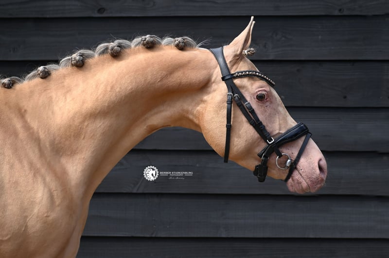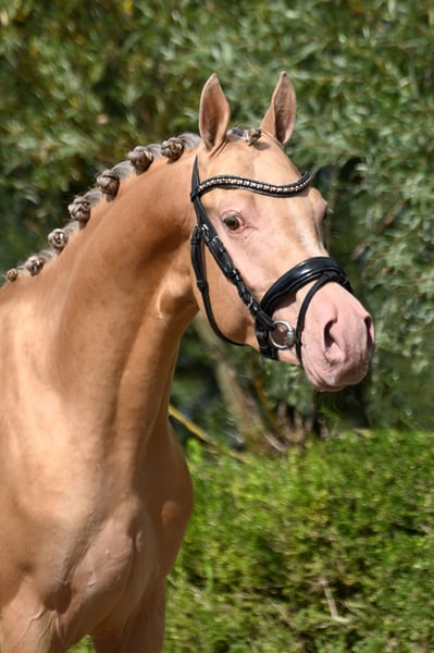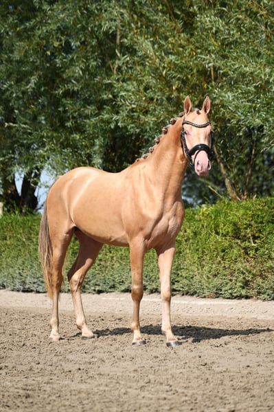ESPERIDION DOUX LORENZO es especial en muchos aspectos. Lorenzo es un semental homozygotico de Champagne ámbar, con un carácter excepcional, bien domado bajo la silla y muy versátil. Trabajamos con él con mucho gusto todos los días, y ahora ha llegado el momento de que pueda hacer muy feliz a un jinete o criador. Nacido el 6 de junio de 2022, chipado, con pasaporte, vacunado, desparasitizado y herrado. Lorenzo está inscrito en el NRPS y aprobado por AES, y se espera que tenga sus primeros descendientes en 2026. Como es homozygotico de color Champagne, todos sus hijos heredarán este color. Sospechamos que será el único semental en Europa de este tamaño con estas características. Desde hace unas semanas, Lorenzo está montado; es tranquilo y fácil de montar incluso para niños. Lo hemos entrenado en doma clásica, además de saltar, realizar paseos en bosque y en la playa. A partir de enero, tiene la edad legal para competir en concursos, y tanto física como mentalmente está preparado para ello. Como puede ver, Lorenzo tiene una genealogía magnífica y, a pesar de su color tan especial, no se ha hecho concesiones en cuanto a calidad. Esperamos que en su nuevo hogar pueda destacar tanto en la competición como en la cría.