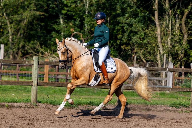 Ben jij op zoek naar dé perfecte sportpony, die altijd 200% inzet toont en super lief is? Lees dan snel verder! Harrisson's Gold is een stoere, prachtige, 3 jarige palomino hengst die in alle opzichten zijn naam eer aan doet. Hij meet op dit moment 1.52m. Deze jonge hengst is een nakomeling van His Royal Badness DK, de Internationaal FEI dressuur, Z2 geklasseerde hengst die ook met het EK meegelopen heeft. Daarnaast springt zijn zus aan moeders kant 1.20 op international FEI niveau. Deze lijn kenmerkt zich niet alleen met fijne sportpony’s maar vooral door hun lieve, zachtaardige karakter. Harry is een droompony. Als veulen haalde hij met vlag en wimpel zijn 1e premie. Tijdens de hengstenkeuring behaalde hij zijn dekbrevet waarbij hij maar liefst een 9 scoorde voor draf, gallop en vrijspringen. Zijn laagste score was niet lager dan een 8! Zijn prachtige gangen, draagkracht en souplesse komen ook onder het zadel goed tot uiting. Harry wordt sinds 3,5 week door een Inter 1 amazone doorgereden, nadat hij op een rustig tempo zadelmak is gemaakt. Dit ging vanzelf! Quote van de amazone: "Harry is écht een droompony! Ik heb de eigenaresse zelfs gevraagd hem niet te verkopen! Ik ken geen enkele 3 jarige die ik vóór het rijden nóóit hoef te longeren. Ongeacht het weer in de afgelopen weken ben ik telkens zo opgestapt, waarbij ik eerst een stuk onder het zadel over de weg instap. Harry wil zo ontzettend graag werken en heeft 3 super fijne gangen. Als ik het geld ervoor had, dan had ik Harry echt zelf gekocht!" Ook in de omgang is deze pony een ware gentleman. Harry heeft totaal geen hengstengedrag. Niet onder het zadel en ook niet wanneer hij getraind wordt en met meerdere paarden/pony's in de rijbaan is. Ook staat Harry met een andere hengst in de wei en paddock. Op stal staat hij het hele jaar zonder problemen naast mijn merrie. Hij geniet van een poetsbeurt en gaat voor de afwisseling ook regelmatig met onze andere paarden mee op buitenrit.