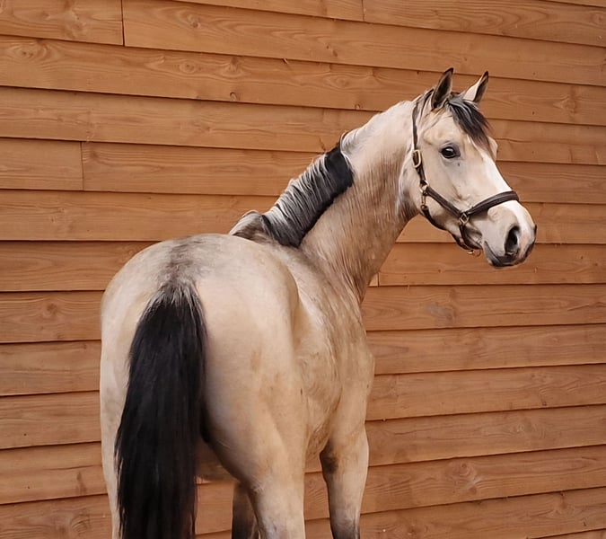 Spectaculaire 3 jarige valkhengst! Krem x Vivaldi x Temptation Hij beweegt met veel takt en souplesse! Hij heeft momenteel een stokmaat van circa 1.64m. Zal nog een spurtje gaan maken. Hij is rontgen gekeurd incl. Hals en rug. Nu nog onbeleerd. Hij heeft een aanhankelijk karakter en geniet van aandacht, komt graag ff bij je staan. Voor meer info en/of filmpje graag ff bellen of appen, 0613704472 #valk #buckskin #dressagehorsesofinstagram #forsale #buckskinsofinstagram
