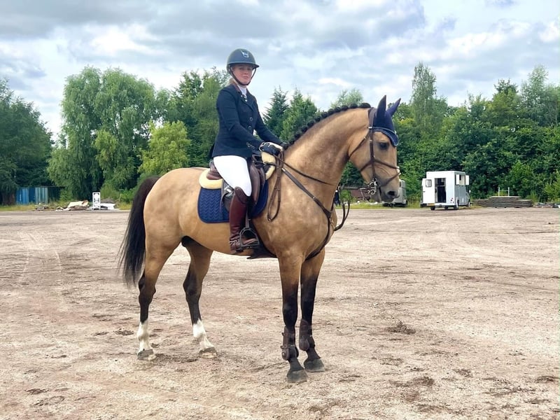 NEW ADVERTISEMENT: Westland van de Teugenaar is a 3,5 years old allround NRPS gelding (10-05-2022). He measures now 1.67m and is expected to grow around the 1.69/1.70m. With his beautiful buckskin color, he's a real eye-catcher! CLEAN X-RAYS! Westland has a very interesting pedigree that combines dressage and jumping: Whatever van de Teugenaar (Whiteyassar x Montreal VDL x Emilion x Alme) x Discovery x Jonggor’s Weyden. We've owned his dam for 14 years now and she competed at Z1 dressage level with us and also jumped at 1.20m level before (she has been used as a breeding mare / broodmare in the last years). She also has the "Performance Sport" and "Keur" predicates and is WFFS-free. She is a Discovery x Jonggor’s Weyden. Behind Discovery are the stallions Dolany, Donnerhall, Donnerwetter Lorentin I, and Loutano, all of whom have competed at Grand Prix level. Donnerhall has over 160 approved sons and also got a lot of victories! Donnerhall achieved an individual third place (bronze) and team gold at the World Equestrian Games in Den Haag. At the World Championships in Rome, the German dressage team won a gold medal. Jonggor’s Weyden is the dam's sire and competes at Grand Prix level. He is the only approved dressage stallion in the world to ever win an individual medal at the Olympic Games. At the Atlanta Olympics, Jonggor’s Weyden, ridden by Sven Rothenberger, produced team silver and an individual bronze medal. In Westland's damline, you'll find, in addition to many other awards, the stallion Aktion, who also competed at Grand Prix level. Further back in the damline, we also find the stallion Pion, who was a Z2 dressage stallion and a 1.40m show jumper. There's also Akteur, who was a 1.60m show jumper. Westland's sire is the buckskin stallion Whatever van de Teugenaar (we also bred him ourselves). After successfully competing in his first competitions in the Netherlands, including two appearances at the Regional Championships with an amateur rider, he was sold to a French show jumper who also competed him in Belgium. He is now based in Italy, competing at 1.30m and being further prepared for higher-level. He is approved by the EU-recognized RBP Studbook and is out of the approved Cremello show jumping stallion Whiteyassar (who has passed away). He also comes from a very good damline, combining both sport and predicates. This line includes the renowned show jumping stallions Montreal VDL, Nimmerdor, Emilion, Wellington, and Alme, all of whom jump at 1.60m level. The renowned stallion Indoctro, who jumped at 1.40m level, is also in this line. His dam competed at 1.20m level under several riders in Belgium, the Netherlands, and France. Westland has a promising and allround pedigree. He is suitable for dressage, show jumping, and eventing. We just started to make him saddle broken. He already knows the bridle, saddle and the lunge. He has no (stable) vices! He has also CLEAN X-RAYS (without any remarks)! Pedigree: https://www.horsetelex.nl/horses/pedigree/2314022/westland-van-de-teugenaar The second-to-last photos are of the dam (Discovery x Jonggor's Weyden), and the last photos are of the sire, Whatever van de Teugenaar (Whiteyassar x Montreal VDL x Emilion x Alme). € 18.000