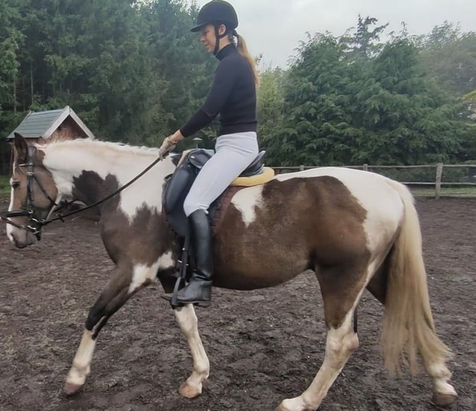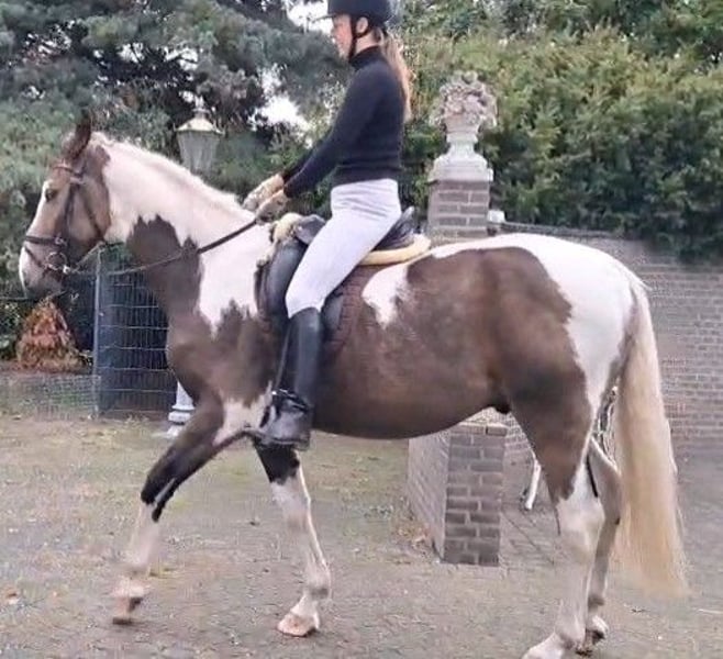 Unieke bonte valk ruin, talentvolle en bijzondere verschijning, 3 jaar oud. Een paard om mee te schitteren in de ring of een parcours. Bont valk is een kleur die zelden voorkomt! #Tobiano buckskin# Wil jij een echt uniek paard, niet alleen qua karakter, maar ook qua looks en beweging? Zoek dan niet verder! Hij is niet alleen mooi, opwaarts gebouwd met 3 zeer fijne en ruime gangen, ook qua karakter is dit een vriend voor het leven! Een liefdevol, betrouwbaar, eerlijk en zachtaardig maatje die voor je door het vuur gaat! GEGEVENS: -Geboren op 16-05-2022. -Meet momenteel 1.63m. Verwachtte stokmaat rond 1.65m. -Ingeschreven bij het NRPS. -Gechipt, gevaccineerd, ontwormd indien nodig en onder controle van tandarts. KARAKTER: -Makkelijk in de omgang, waarbij vertrouwen voor hem heel belangrijk is. -Gevoelig voor de hulpen waardoor zeer makkelijk trainbaar. Perfect voor dressuur. -Aanhankelijk, eerlijk, betrouwbaar, lief, enorme knuffel. -Heeft een duidelijke, consequente leider nodig die eerlijk, geduldig, liefdevol en zachtaardig is. Een harde hand begrijpt hij niet, wordt hij bang van en kruipt vervolgens in zijn schulp. -Hij geeft duidelijk zijn gens aan, bij vermoeidheid vraagt hij respectvol om te stoppen. UITERLIJKE KENMERKEN -Elegante maar sterke bouw. -Sterk gespierde achterhand en hals. -Veelkleurig: bonte valk (tobiano buckskin). Zijdezachte, stralende vacht. Een echte toverbal qua kleuren. Bij elk seizoen veranderd de valk kleur van tint. -Manen/staart: volle staart, voornamelijk wit, met een beetje zwart. Manen voornamelijk wit met in zijn voor pluk zwart en bruin. Wimpers wit en zwart. Let op; vachtkleur valk lijkt op de foto bruin maar is in het echt duidelijk te zien als valk kleur! -Uitstekende gezondheid en zeer sterke hoeven! -Ontzettend lenig, pré voor de dressuur. BEKEND MET: -Volledig verkeersmak. Bekend met alle landbouw voertuigen, vrachtverkeer en overige voertuigen en weggebruikers. -Bekend met meerdere soorten dieren. -Braaf bij de hoefsmid, dierenarts en tandarts. -Zadelmak en bekend met wandelen, longeren, grondwerk, Natural Horsemanship, parelli etc, en houdt van zwemmen! -Bekend met longe, pessoa, mentuig, barebackpad, zadel, dekens en overige materialen. -Momenteel wordt er alleen gestapt onder het zadel. -Uitermate geschikt voor de sport. Zowel dressuur als springen of mennen, alsook recreatief. -Erg leergierig en werkwillend paard. -Hele geschiedenis is bekend. In ons bezit vanaf de leeftijd van 6 maanden. Direct alles geleerd en van alles al mee gedaan. -Heeft altijd 24/7 buiten gestaan in paddock met in en uitloop stal, zomers weidegang. Van het tweetal paarden dat wij hebben, is hij bij ons de "kudde" leider. AFSTAMMING: #V: Poolse cremmelo hengst #VM: HURO'S FANTASTIC COLOR Hengst 2010 Bont 1,73 m KWPN 528003201012094 1,30m Spr. ZZ-Licht Bij interesse website stamboom ontvang ik graag een bericht #VMM: NANDO Hengst 1995 Zwart 1,64M KWPN 528003199500961 Tuigpaard LK+55 Bij interesse website stamboom ontvang ik graag een bericht Moeder ingeschreven bij het AES stamboom, waarvan haar vader en voorouders KWPN'ers zijn en allen top presteren als springpaard in de spring sport tot 1,70m hoogte. Haar moeder en ouders van haar moeder zijn allen KWPN'ers en presteren allemaal hoog in de sport bij mennen. Moeder wordt zowel bereden als gemend. #Er is tot nu toe alleen een aanvang gemaakt met stappen onder het zadel. Gezien de bak met de huidige weersomstandigheden amper bruikbaar is, zal dit niet verder opgepakt kunnen worden momenteel. Hij pakt alles verder zeer snel en zeer makkelijk op. Gezien zijn jonge leeftijd willen we niets overhaasten. Proef rijden is om deze redenen niet mogelijk. Hij is dus verder nog volledig naar eigen hand te zetten. Een beginnende ruiter is dan ook niet diegene die wij als toekomstig eigenaar zien.# Foto's van verschillende leeftijden. Van net geboren tot nu. Ruiter op de foto is 1,75m. Laatste foto's zijn van de ouders. Zijn vader is een Cremmelo hengst met blauwe ogen. Zijn moeder bont. Vraagprijs: €7.000,- Eventueel zwart lederen dressuurzadel ter overname voor €250,- en mogelijkheid tot overname van verdere benodigdheden. Filmpjes van onder het zadel op aanvraag. Zie mijn andere advertentie voor verkoop ander paard. Paarden mogen weg in verband met beëindigen hobby wegens gebrek aan tijd. Ze staan ons zeker niet in de weg! Bent u enthousiast geworden en zou u dit prachtig dier graag ontmoeten, dan hoor ik graag van u! Op zaterdagen niet bereikbaar.