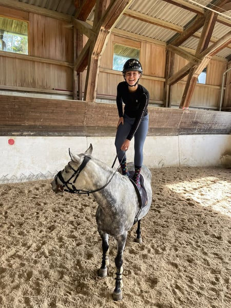 Nous vendons notre chère "Bettina". Betti est une ponette de sport néerlandaise de 11 ans (robe baie, 147 cm). Au cours des trois dernières années, Betti a pu accumuler de l’expérience dans de nombreux domaines avec moi, allant des semaines de randonnée, des sorties à cheval même sans selle, beaucoup de travail à pied et de nombreuses excursions, jusqu’à l’apprentissage en dressage et la compétition de saut d’obstacles. Partout, elle a toujours fait preuve d’engagement, d’attention et de finesse. Elle répond facilement aux aides et possède trois allures de base très bonnes. Grâce à sa sensibilité, elle convient particulièrement comme cheval pour jeunes ou dames, mais en raison de sa sensibilité, elle n’est pas adaptée aux jeunes enfants ou aux débutants. Par le passé, Betti a également été utilisée occasionnellement en école d’équitation et peut être monté sans problème par des jeunes cavaliers à partir du niveau N. Pour les cavaliers de loisir ambitieux, Betti est un rêve !! Elle est également enregistrée comme poulinière. Son pedigree est excellent : (Ascendant : Quettino de Florys ; Descendant : King Kalido-B). Betti a participé à plusieurs concours de saut d’obstacles et a été victorieuse jusqu’à des épreuves A*. Elle possède du talent, mais ne montre pas la même passion pour le saut que dans d’autres disciplines. C’est pourquoi nous souhaitons lui trouver un foyer où la compétition ou le saut ne seraient pas la priorité. Note : Betti tète, mais cela n’affecte ni sa santé ni ses performances. Nous donnons Betti à contrecoeur, car sa cavalière passe à un grand cheval. Il est d’autant plus important pour nous qu’elle trouve une famille qui l’apprécie et la soutient. Pas de marchands !
