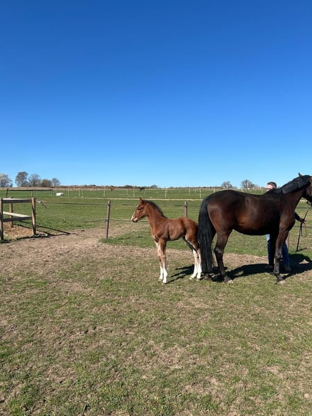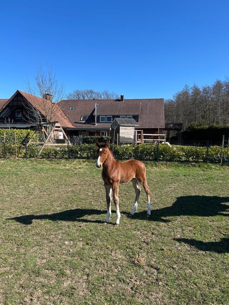 Poulin de étalon magnifique et bien dessiné, fils de Stakkato Cornet. Né le 14.03.2025. Le père Stakkato Cornet a impressionné lors de ses premières compétitions en tant que cheval de quatre ans. La mère a couru avec succès jusqu'au niveau M en saut d'obstacles (jusqu'en 2019). La jument est dans l'élevage depuis 2020. Il y a des frères et sœurs qui ont couru avec succès jusqu'au niveau S en saut d'obstacles.