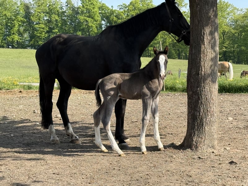 You really couldn't paint him any more beautifully: Large-framed black stallion with 4 white socks and a blaze, he has a lot of neck and stands there with incredible movement, waiting for a great future. With a lot of impulsion, rhythm, and knee action, he impresses not only with his movement. The maternal line consistently passes on clarity of mind, above-average rideability, and suitability for amateurs! She is the daughter of a Stedinger x Rohdiamant mare, who herself was successful up to the M class. The 3/4 brother is Sam OLD, who was already a Grand Prix winner at the age of 7. Her sister is pregnant and was with us last year (at 5 years old) 6 times at competitions: 4 wins and 2 placements! An absolute stallion type that could also pursue a path as a candidate for licensing. Video: https://youtu.be/YlY7U55PlKc?si=2_8vDHerVXIOuNTf (2 weeks old) Picture 2 days old