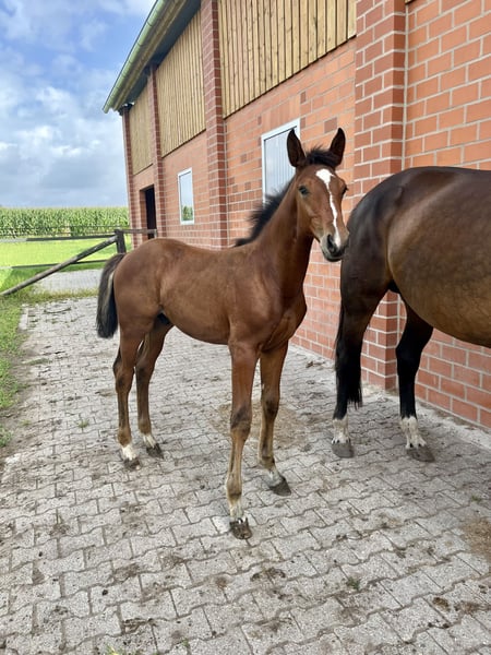 Premium Oldenburg colt by Verbier x Fidertanz x Alabaster, available from April 20, 2025 A tall, leggy foal with excellent scope, very good movement, and a strong back. The sire, Verbier, was the champion stallion of Oldenburg 2024 and the winner of the 2025 licensing test. The dam, Amira, is a full sister to Franziskus (from the Daffy-Toban xx family), who was very successful in dressage under Ingrid Klimke. She has already produced several type- and movement-rich auction foals for Vechta. Please contact us at 0173 9263870 if interested.
