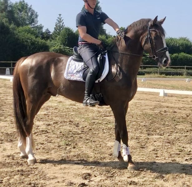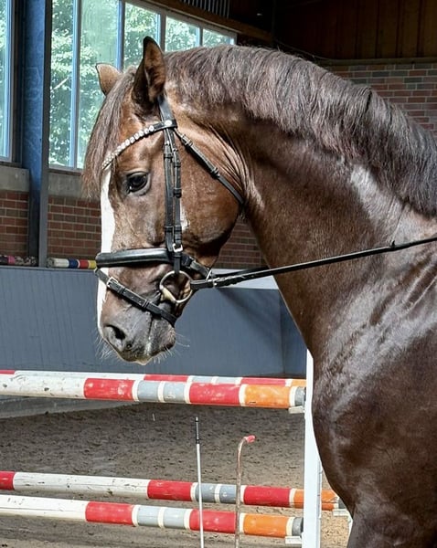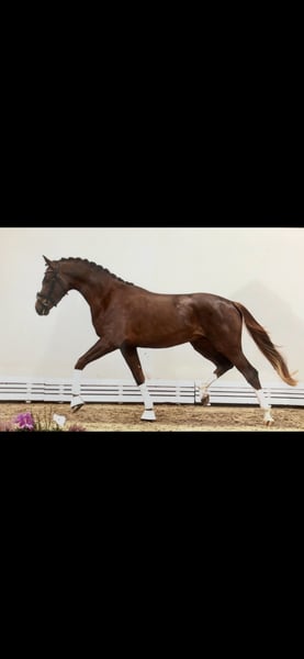 Offered is a dreamily beautiful Oldenburg dark chestnut, 3-year-old stallion registered with the Anglo European Studbook and thus freshly under saddle. Currently 172 cm tall. Sezuan’s Donnerhall x Don Gregory. Expressive, always eager to learn, motivated, and diligent. Already solid, fine to ride, and always easy to handle. His character is balanced and affectionate, attentive to people. No vices. X-ray findings without any objections. Of course, he is well-behaved for the farrier and loading. He is familiar with children, dogs, cats, tractors, etc. He is used to both open stable housing in a herd and loose housing. In the meantime, he has moved into a spacious box for training. So far, he is free from any injuries or illnesses. I am happy to send short video clips and important details via private message, but this does not replace an "on-site" viewing, getting to know him, and trying him out! Location: Germany.