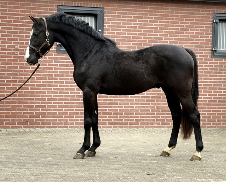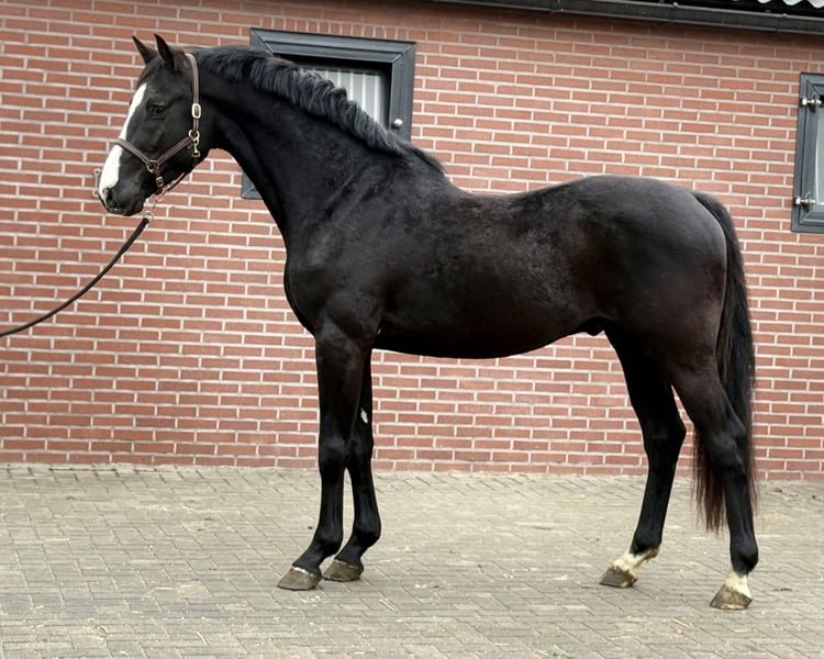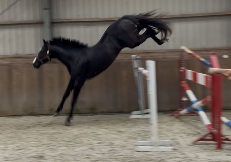 Prachtige zwarte springhengst met veel springpotentieel. Geboren in 2022. Zijn huidige stokmaat is 1.68 m. Zoals u kunt zien op de foto is hij wat week in zijn rug, valt wat weg achter de schoft, mede daarom is hij scherp geprijst. Het staat een sportcarriére niet in de weg. Voor de rest is hij zeer correct en gezond. Hij is een prettige hengst in de stal en aan de hand. Top Holsteiner stamboom: DIAMANT DE OPERETTA x QUINTERO De vader is een nakomeling van DIAMANT DE SEMILLY. Hij heeft op internationaal niveau gesprongen. De moeder van dit paard heeft zelf op internationaal niveau (1,45 m) gesprongen. Bij interesse graaf bellen of appen 📱 +31(0)643197337 📱 +31(0)648271956
