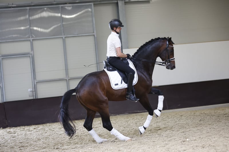 Furore Fantastico – un étalon qui porte parfaitement son nom. Ce reproducteur d’exception, inscrit en 2020 à Oldenburg, a passé toutes ses épreuves de performance avec des notes exceptionnelles, bien au-delà de 8. En 2024, il s’est distingué au Kronberghof en remportant la qualification pour le championnat fédéral, en enchaînant ensuite victoire après victoire, en dressage de niveau M à S. Cette année déjà, il a remporté la catégorie des jeunes chevaux S, prouvant ainsi de manière impressionnante son potentiel pour la grande scène. Son dressage a toujours été adapté à son âge et effectué de manière sérieuse, ce qui se reflète dans sa facilité de dressage et son caractère sincère et volontaire. Furore Fantastico se distingue non seulement par ses qualités exceptionnelles de mouvement et d’expression, mais aussi par son charisme naturel, qui lui garantit la sympathie des juges et du public lors de chaque compétition. C’est un cheval qui conquiert le cœur – aussi bien en compétition qu’au box. Dans son entraînement quotidien, il se montre très motivé, fiable et facile à gérer. D’un tempérament calme en forge et lors du déchargement, il est robuste nerveusement et toujours prêt à travailler, un partenaire qui veut donner le meilleur de lui-même chaque jour. Un étalon qui réunit tout : type, talent, caractère – et cette petite touche en plus qui fait la différence chez les gagnants. Des radiographies récentes sont disponibles et, bien entendu, sans anomalie. Furore Fantastico se trouve près de Vienne et peut être visité à tout moment. Les vidéos ne seront envoyées qu’après un premier entretien téléphonique.