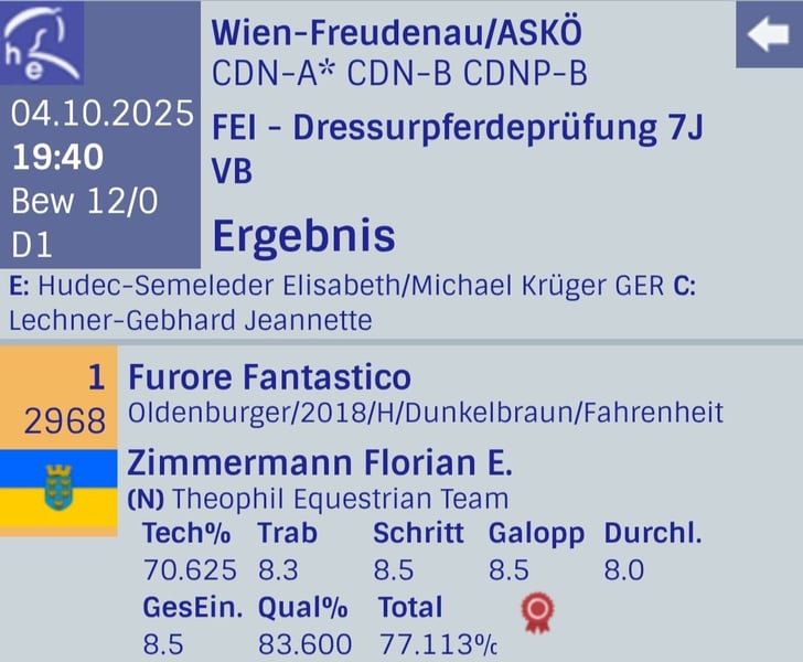 Furore Fantastico – Halbbruder zu Flynn FRH Weltrangliste Nr. 1 U25 Der 2020 in Oldenburg gekörte Ausnahmehengst hat sämtliche Leistungsprüfungen mit Traumnoten weit über 8 absolviert. 2024 überzeugte er am Kronberghof als Sieger der Bundeschampionatsqualifikation und seither reiht er Sieg an Sieg – von M- bis S-Dressuren. Bereits in diesem Jahr konnte er Dressurprüfungen der Klasse S gewinnen und stellt damit eindrucksvoll sein Potenzial für die große Bühne unter Beweis. Seine Ausbildung erfolgte stets altersgemäß und reell, was sich in seiner Rittigkeit und seinem ehrlichen, leistungsbereiten Charakter widerspiegelt. Furore Fantastico besticht nicht nur durch überragendes Gangvermögen und Ausdruck, sondern auch durch eine charismatische Ausstrahlung, die ihm bei jedem Turnier die Sympathien der Richter und des Publikums garantiert. Er ist ein Pferd, das Herzen gewinnt – im Viereck wie im Stall. Im täglichen Training zeigt er sich höchst motiviert, verlässlich und unkompliziert. Schmiede- und verladefrom, dabei nervenstark und stets arbeitswillig, ist er ein Partner, der jeden Tag sein Bestes geben will. Daher bestens für Junioren, Junge Reiter, U25 und Umsteiger von Pony auf Großpferd geeignet. Ein Hengst, der alles vereint: Typ, Talent, Charakter – und das gewisse Etwas, das Sieger ausmacht. Aktuelle Röntgenbilder liegen vor und sind selbstverständlich ohne Befund. Furore Fantastico befindet sich in der Nähe von Wien und kann jederzeit besichtigt werden. Videos werden ausschließlich nach telefonischem Erstgespräch versandt