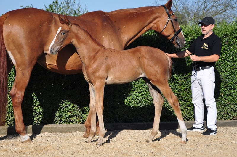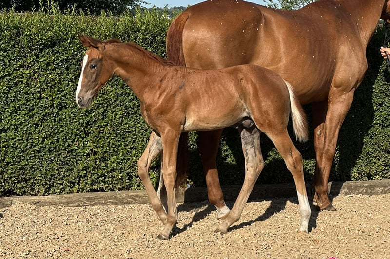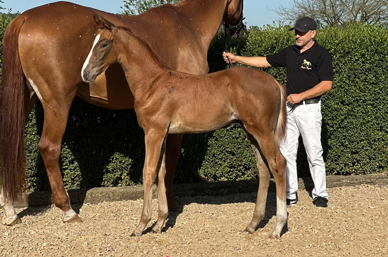 Falcon S (Fidelity - Samba Hit I), geboren am 17.06.2025, Oldenburger Falcon S ist ein hübsches und bewegungsstarkes Hengstfohlen von Fidelity, der derzeit mit Siegen in der Klasse S und Bewertungen von über 75 % glänzt. Mit enormer Bewegungsqualität, hochmoderner Erscheinung und beeindruckender Eleganz begeistert dieser edle Hengst im Dressurviereck. Besonders seine Hinterhandaktivität, geprägt durch einen kraftvollen Abdruck, weites Unterfußen sowie eine vorbildliche Mechanik und große Schulterfreiheit, sorgt für Gänsehautmomente. Bereits zu Beginn seiner Turnierkarriere erhielt Fidelity viel Lob in Form von Top-Bewertungen bis hin zu 9,5 sowie den Titel des Oldenburger Vize-Landeschampions in Rastede. Mit viel Talent für den Grand Prix blickt Fidelity seiner zukünftigen Turnierkarriere sehr optimistisch entgegen. Sein Reitkomfort sowie sein aufgeschlossener, mutiger und äußerst liebenswürdiger Charakter wurden ihm bereits bei der Hengstleistungsprüfung bestätigt. Für sein Interieur, seinen Charakter, sein Temperament und den Galopp erhielt Fidelity eine glatte 9,0. Seine vorbildliche Rittigkeit wurde mit 8,75 bewertet. Die Mutter Medea S war auf verschiedenen Zuchtschauen für junge Pferde äußerst erfolgreich (Höchstnote für Typ 10,0). Ihr Vater Samba Hit I stammt aus der berühmten P-Familie (Neustadt Dosse) und wurde 2001 Vize-Bundeschampion. Ein Jahr später gewann er die Gesamt- und Dressurwertung bei der Hengstleistungsprüfung in Neustadt (Dosse). Seine berühmte Vollschwester Poetin I wurde Bundeschampionesse 2000 und 2003 sowie Weltmeisterin 2003. Samba Hit I war sportlich bis Grand Prix erfolgreich. Transport kann gegen Kostenerstattung organisiert werden.