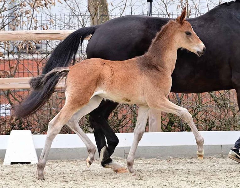 "Dream of Obsession" is a charming, brown Oldenburg colt from a proven dam line. He was born on February 5, 2025, at our farm. He is very affectionate, people-oriented, and already halter-trained. He demonstrates very good basic gaits, with his expansive walk being particularly noteworthy. His mother is stunning, very rideable, and has a lovely temperament! She stands approximately 1.70m tall, and her foal will most likely reach this height as well. His father is the Bundeschampionat finalist Dream Royal. Dream Royal's mother is the full sister of the successful DSP Queen Rubin in World Cup dressage, ridden by Antonia von Dungern. His mother Onoeska is the sister of the Intermediaire I successful Kavallo by Desperado/Micky Schelstraete, NED. Grandmother Ganoeska is the sister of the Intermediaire I horse Elcapone by Wynton/José Miguel Egea, ESP, and of Upanoeska by Krack C, the mother of the Olympian and US Grand Prix star Suppenkasper by Spielberg/Steffen Peters, USA. The lineage includes numerous Grand Prix horses, such as Heston For U/Rose Mathisen, SWE, and many more. A meaningful video can be sent via WhatsApp upon request.