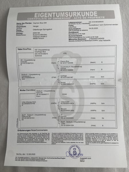 Hello, for sale is my colt, born healthy on May 4, 2025. “Cayman Blue SW” is sired by Charthago Blue OLD (Klatte Stud) out of my eight-year-old mare, Uriko x Cormint. The foal is very friendly and would never kick or bite. He inherits his great character from his father, Charthago Blue OLD, who is currently being successfully presented at competitions by the young Johanna Klatte. I started riding his mother myself in early 2023 when she was six years old, and she was always very well-behaved. Unfortunately, due to my job, I no longer had the necessary time to further develop her, so I decided to have her bred. In the jumping arena, the mare always showed bravery, focus, and was always ready to jump from any position. She always wanted to get to the other side and never stopped. With these two amazing and talented horses as parents, I have a lot of confidence that the foal will not only jump exceptionally well but will also possess a very honest and wonderful character. On June 21, 2025, the little guy was already able to show himself from his best side and was awarded at Klatte Stud. The entire presentation can also be found on Clip My Horse. The mare is also for sale, as I would like to switch to ponies. If you are interested, please feel free to send me a message or contact me directly via WhatsApp at: 0151-62483437