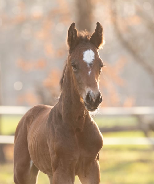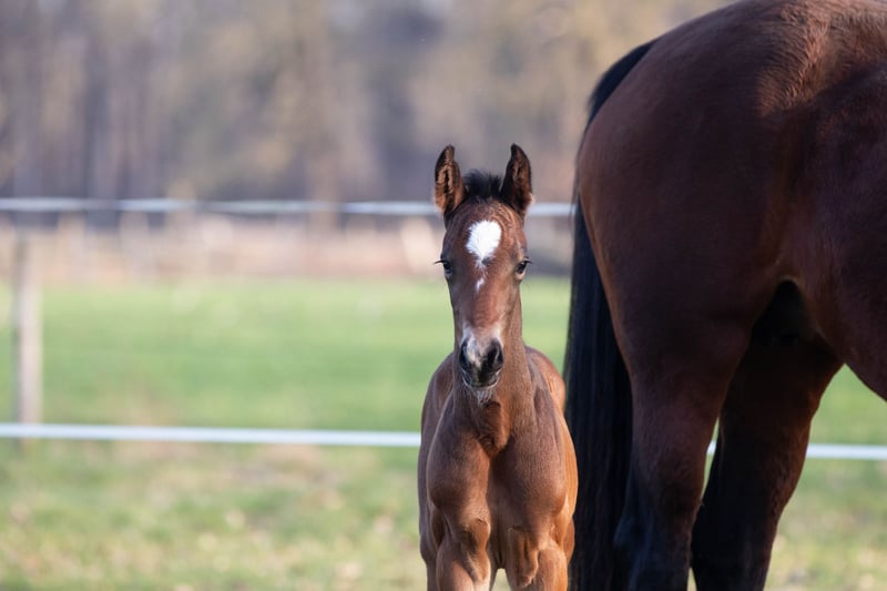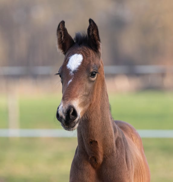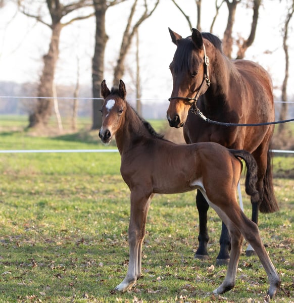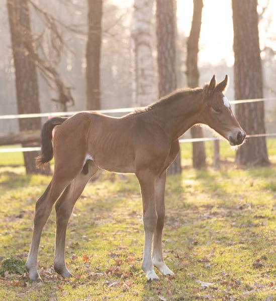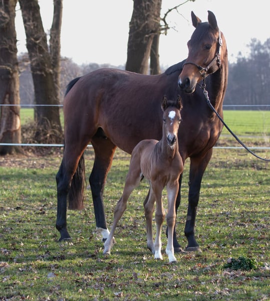 Arno M nació a principios de marzo en nuestra cuadra y ahora está a la venta. Hasta ahora, ha demostrado ser muy sociable y cercano a las personas. No se puede negar su ascendencia de su padre, My Blue Hors Santiano. Por parte de madre, proviene de la famosa línea de la Weltfee. Su abuela, Silvana, obtuvo el título de yegua de élite el año pasado, y su madre, Valea, realizó una buena prueba de yeguas en 2023, siendo galardonada con la distinción de la Prima de la Asociación.