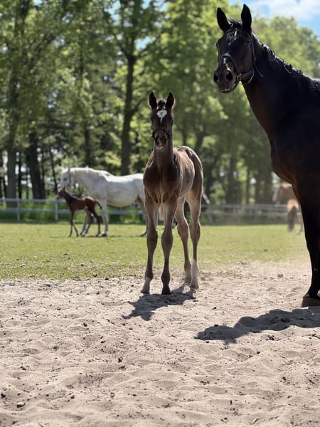 Nino S ist ein schicker groß werdender am 12.04.2025 geborener Hengst. Er stammt ab von Newmarket ( Chacoon Blue x Numero Uno x Carthago) aus einer Quintender x Landjonker Mutter. Nino kennt das Fohlen ABC, ist frisch abgesetzt und wächst im Herdenverband mit anderen Hengst-u. Stutfohlen auf. Grundsätzlich besteht bei Interesse die Möglichkeit, dass er die Aufzucht über bei uns und seinen Kumpels zu bleiben( auch als Hengst). Seine Mutter habe ich von ihrer Züchterin übernommen und sie bis M-Springen vorgestellt. Leider hat sie sich in der Box beim wälzen verletzt (mit dem Hinterfuß unter der Boxentür her getreten und festgehangen), weshalb wir sie nach dem Heilungsprozess in die Zucht nahmen und nicht wieder im Sport eingesetzt haben. Unter dem Sattel überzeugte sie mit leistungswillen, Mut, Vermögen, Vorsicht und Ergeiz, wie guter Rittigkeit, welches sie bislang an ihre Nachkommen und ihre erste Enkelin weiter gibt. Ihre erste Tochter ist nun 6jährig. Sie hatte 4j. bereits ein Fohlen und ist nun bis M-Springen erfolgreich und wir blicken mit Spannung und Vorfreude auf das nächste Jahr. Bislang hat sich Nino‘s Mutter immer sehr groß vererbt (175-180cm), daher gehen wir davon aus, das auch er groß wird. Trotz der Größe waren seine Geschwister bislang alle immer sehr rittig, einfach zu reiten und vom Typ geschlossene Pferde. Eingetragen wird er bei einem Sammeltermin bei uns am Hof im Oldenburger Springpferde Verband, da auch hier seine Mutter eingetragen ist und unsere anderen Fohlen eingetragen werden. Ein kennenlernen ist jederzeit möglich.