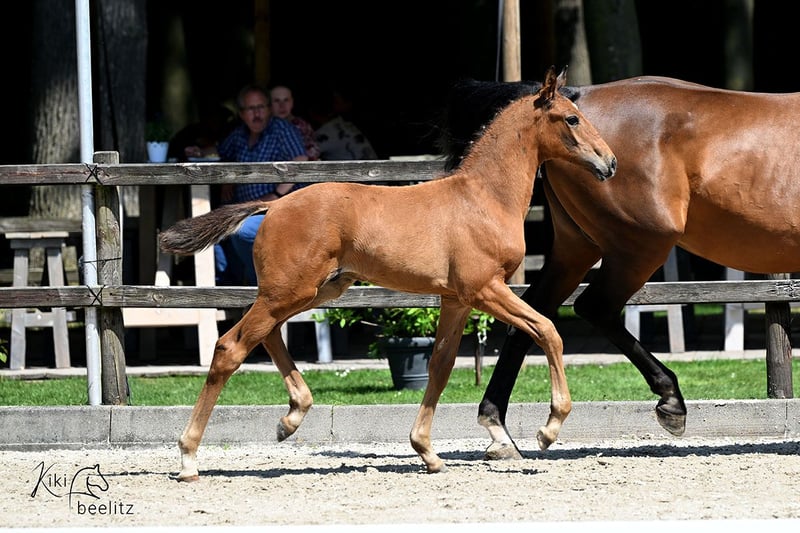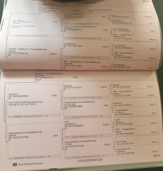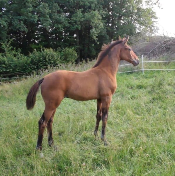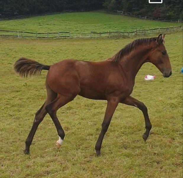 Typstarkes interessant gezogenes Hengstfohlen. Erster Fohlenjahrgang vom Junghengst Sir Jack vom Gestüt Schafhof. Prämiert durch den Oldenburger Verband. Im Pedigree sind väterlicherseits die alten Dressurlinien von Sir Donnerhall, Londonderry und Rohdiamant. Mütterlicherseits die alten Linien von Grannus und Argentinus und Pik Trumpf. Wächst bei uns in einer kleinen Stutenherde auf. Führen am Halfter (auch schon an der Straße geführt, von einer zur nächsten Weide), Hufe geben usw. macht er auch super. Wir sind uns sicher, dass auch welchen Weg er einschlagen wird, ob Dressur, Springen oder Vielseitigkeit, ihm alle Türen offen stehen. Videos können bei Interesse gerne verschickt werden