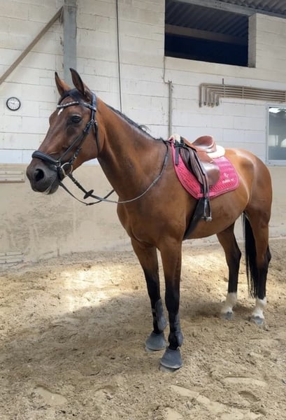 For sale: an impressive Oldenburg show jumping gelding, born in 2015. Standing at 16.1 hh, this dark bay gelding is an ideal partner for ambitious show jumpers. He has a solid basic education and consistently performs well in the arena, demonstrating reliability and good rideability. His athletic build and natural talent for jumping make him a promising candidate for the competitive sport. This well- and gently ridden Oldenburg jumper impresses with his willingness to perform and his strong jumping ability. A horse that offers exciting prospects for both ambitious amateurs and professional riders. He is a family horse and enjoys any kind of fun.