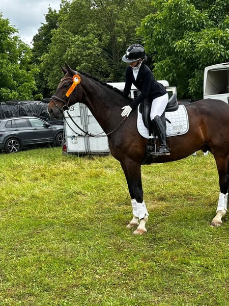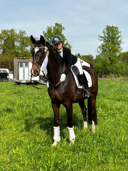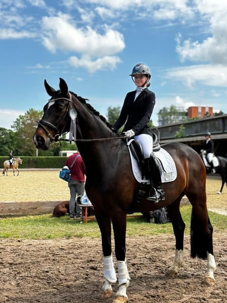 Year of Birth: 2015 Color: Bay Height: approximately 17.3 hh This expressive Oldenburg gelding by Fürst Wilhelm x Fidermark impresses with excellent rideability and consistently good performances: * Over 30 wins and placings in dressage competitions at L level with scores up to 8.1 * M* placed and ready for M** level * Member of the Children’s State Squad, participant in regional championships, and the Schafhof Youth Festival An ideal horse for children or riders transitioning to higher levels. Always motivated, light to ride, and reliable both in daily training and at competitions. Health: TÜV (veterinary check) conducted four years ago with no notable findings (a current TÜV can be arranged upon request) Price: The asking price is at the higher end within this category.