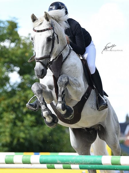 For sale is an exceptionally gentle and uncomplicated horse who impresses not only in sport but also with his lovable and friendly nature — truly a gentleman with a competitive spirit and a kind heart ✨ Jimmy always keeps a clear head, whether in training, at competitions, or out on the trail. Even a spirited mare cannot ruffle his composure, yet he has enough go to effortlessly clear a 125 cm course. He always aims for the next jump and strives to compensate for rider errors. Thanks to his excellent dynamics and technique over the fences, Jimmy feels limitless. He has been shown and placed in current competition year. In dressage, he is very responsive and easy to ride, without spurs or whip, always light and straightforward with aids. Naturally, he is suitable for children or less experienced riders as well. In handling, Jimmy is a dream — he leads, grooms, goes out to pasture, paddock, walks in the lunging ring, and is easy to load into the trailer — even without a stud gate, with neighbors! He is comfortable being transported by truck, bathed, and ridden without a saddle... all of this is no problem at all! We wish for this truly extraordinary horse to find a 5-star ⭐️ home where he lacks for nothing. Where he can be a sport horse, a friend, and a beloved heart horse — where he is spoiled, lovingly cared for, and supported, yet still allowed to be a horse! 💛 Jimmy is only available to the best of hands ✨ A get-to-know and trial ride is always possible. We charge a fee of €30, which will be deducted from the purchase price. Location: 65549 Sold on behalf of the owner