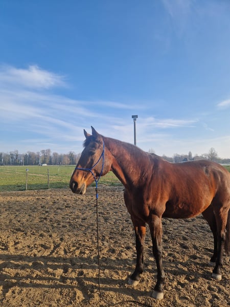 Jetset überzeugt durch seine aussergewöhnliche Vielseitigkeit und seinen tollen Charakter. Ob bei der Arbeit auf dem Sandplatz, bei kleinen Sprüngen, im Parelli-Training (Left Brain Extrovert), bei Zirkuslektionen, entspannten Ausritten oder einfach beim spielerischen Zusammensein – Jetset ist mit Freude und Motivation bei jeder Aufgabe dabei. Besonders hervorzuheben ist seine Erfahrung im pferdegestützten Coaching. In der Arbeit mit Menschen zeigt er sich äusserst feinfühlig, zuverlässig und geht in dieser Aufgabe voll und ganz auf. Jetset ist absolut sozialverträglich und geniesst es sehr, täglich Zeit auf der Weide mit seinen Artgenossen zu verbringen. Im Umgang ist er ausgesprochen lieb, unkompliziert und menschenbezogen. Schweren Herzens suche ich für Jetset einen neuen Lebensplatz, da sich meine persönlichen Umstände verändert haben. Ich wünsche mir für ihn einen liebevollen Menschen, der seine Vielseitigkeit zu schätzen weiss und ihm ein artgerechtes Zuhause bieten kann. Schön wäre auch, wenn er in Greng stehen bleiben könnte. Weiter Infos, Fotos oder Videos auf Anfrage. ________________________________________________________________________________ Jetset séduit par son extraordinaire polyvalence et son formidable caractère. Que ce soit lors du travail sur terrain sablé, pour de petits sauts, dans le cadre de l'entraînement Parelli (Left Brain Extrovert), lors de leçons de cirque, de balades détendues ou simplement pour passer un moment ludique ensemble, Jetset aborde chaque tâche avec joie et motivation. Il convient de souligner tout particulièrement son expérience dans le coaching assisté par le cheval. Dans son travail avec les humains, il se montre extrêmement sensible, fiable et s'investit pleinement dans cette tâche. Jetset est parfaitement sociable et apprécie beaucoup de passer du temps chaque jour au pré avec ses congénères. Au contact des humains, il est particulièrement gentil, simple et attaché à l'homme. C'est le cœur lourd que je cherche un nouveau foyer pour Jetset, car ma situation personnelle a changé. Je souhaite pour lui une personne aimante qui saura apprécier sa polyvalence et lui offrir un foyer adapté à son espèce. Traduit avec DeepL.com (version gratuite) Plus d'informations, de photos ou de vidéos sur demande.