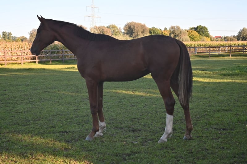 Jeune talent prometteur pour le carré, yearling vigoureux et élégant, déjà hongre, car en troupeau mixte, très bien élevé, toujours bien nourri et minéralisé, pas d'élevage extensif, très sociable au handling, chez le maréchal-ferrant et le vétérinaire, cherche SA place, nos chevaux ont un contact quotidien avec l'homme. 3 bonnes allures de base réelles, pas hypermobile, peut aussi faire le galop et le pas. Lignée très montable. Peut également rester ici pour un élevage ultérieur ! Contact : Andrea Pollich, Tél : 0049-1755252297 e-mail : ostpol@t-online.de