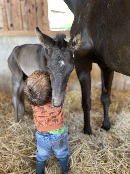 Really stylish 2-year-old black gelding from the first crop of Skyline to b out of a Baroncelli - Regazzoni mare. Sporty elegance meets proven Hanoverian performance blood. His father, Skyline to b, is a true shooting star under Carl Hedin and has qualified for the World Championships of Young Dressage Horses under his new owner and rider Yara Reichert. Full siblings of the mother have been successful up to St. George and include former Verden elite auction horses and licensed stallions. Thus, this young horse promises to pursue a successful dressage career. Easy to handle, always attentive, and very affectionate. He is approximately 166/68+/- cm tall. He has grown up in a herd with peers, is regularly presented to the farrier, and is accustomed to loading. Currently, he is with peers in the pasture in northern Lower Saxony and can stay there until autumn. He already has a good vet check. As a foal, he was awarded the foal premium by the Oldenburg and described as “A typy foal, beautifully constructed uphill with elastic movements swinging through the body.” A video of him in free movement can be sent upon contact.