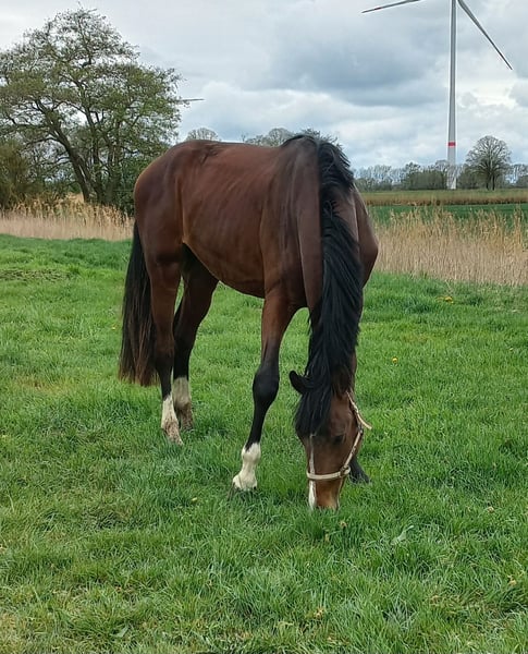 This stunning, registered OS gelding was born in 2023 and comes directly from the breeder. He is being sold solely due to personal circumstances. He has a lot of presence and a correct conformation. He is a pleasure to look at. He grew up with peers in a herd, is familiar with the farrier and veterinarian, and has been dewormed according to his age. The gelding is easy to handle, whether loading, grooming, or simply cuddling. He has an honest and friendly temperament, is human-oriented, curious, and well-mannered. On his sire’s side, he descends from Con Dio, who was awarded the title of best stallion at the licensing and received a 8.7 in the sport test. His grandsire, Cornet Obolensky, ranks among the top ten in the World Breeding Federation’s ranking and is the most successful show jumping sire worldwide. On his dam’s side, he is out of Chacoon Blue. If you are looking for a loyal and reliable partner with whom you can build a promising future, please contact me. 0174 2560279