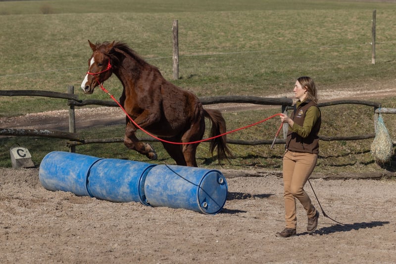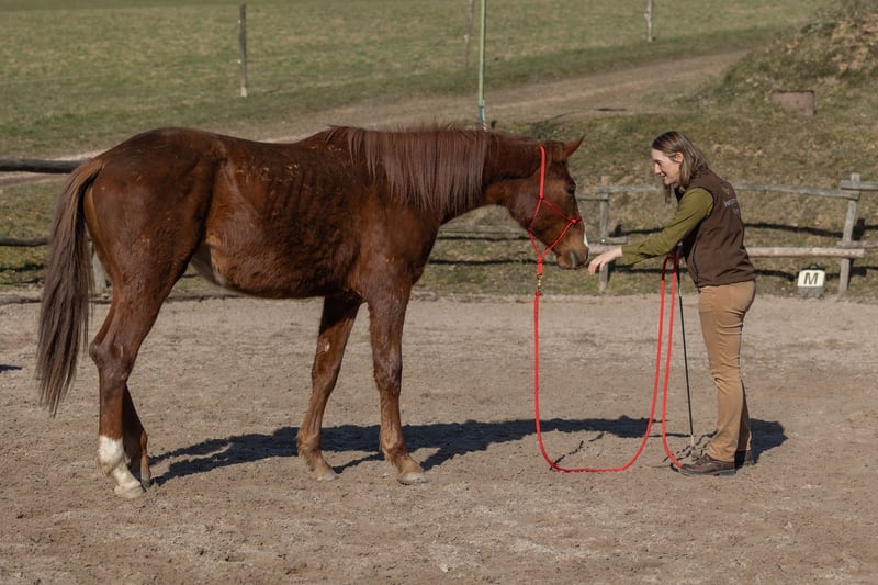 We acquired Oliver in October 2024 from the Oldenburg breeders Antje and Konstantin Stahl directly from the young horse pasture. In the past months, we have played with him on the ground and have gone through the "young horse ABC" with him. At just 2 years old, Oliver is already quite large; we estimate that he will reach a final height of around 1.80m. Visually, he stands out with his expressive, mobile ears and his interrupted blaze in the shape of an hourglass. Physically and mentally, he is currently in full growth, and it benefits him to have regular breaks where his body, mind, and soul can develop in harmony. Oliver's character is simply sweet, extremely positive, and he is up for any fun. In the riding arena, he shows his beautiful gaits on the ground and makes a great effort to understand everything and do it correctly. He is strong-minded, curious, and playful when given enough time to explore new things at his own pace. If he doesn't do something as expected, you can always assume that Oliver simply hasn't understood it correctly yet. He is used to having a dialogue with people and expressing his opinion. With us, Oliver loads easily into the trailer, willingly gives his hooves, takes deworming treatment, allows himself to be touched and groomed everywhere, and stands tied for longer periods. However, we are always cautious with terms like "blacksmith and loading friendly," as this often depends on the individual person the horse is dealing with. In the herd, Oliver is uncomplicated, very playful, and social. Oliver wishes for a person who will accompany him on his journey to becoming a riding horse with good horsemanship skills. Due to his particularly positive attitude towards people, we are confident that he will be the perfect partner in a few years for someone who wants to advance with Oliver to Level 4 and beyond. Oliver will be placed in experienced horsemanship hands and exclusively in open stable and herd housing. If you are interested in Oliver, we hope you will take the time to get to know him calmly with us. Upon request, we are happy to support you in Oliver's further training. Price includes a voucher for a camp or an intensive week at Birkenhof (dates see www.birkenhof-heil.de).