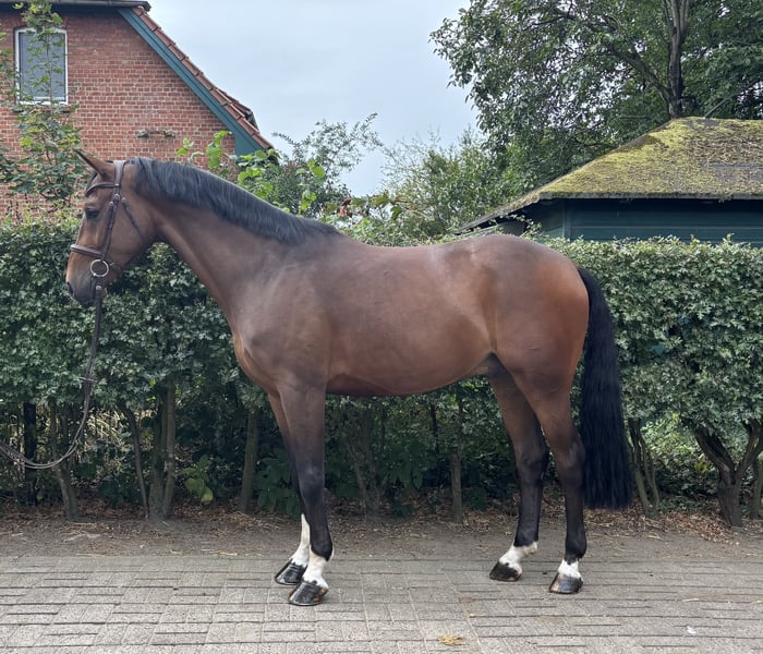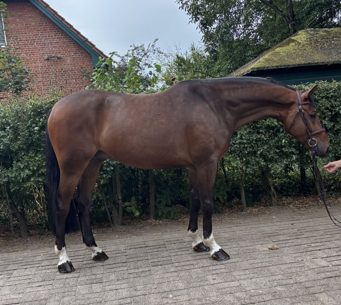 For sale is a stunning dark bay Oldenburg gelding, born in 2020. Standing at 16.8 hh, he offers the perfect size for ambitious leisure riders. He is very well-behaved on the ground, enjoys hacking out, and is very easy to ride. He has successfully competed up to A** level in show jumping with me. He has also placed in a rider’s competition with a young girl. If you are interested and would like more information, please feel free to contact me!