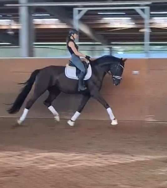 North is an exceptionally beautiful horse with a dark coat and three above-average basic gaits. He exhibits a lot of expression in the trot, and his walk is very elastic with a very expressive overreach. Nordi is very soft in the mouth and responds delicately to the aids. Character-wise, he is very gentle, eager to please, and always wants to do his best. He truly is a superior horse, and we see him competing at the highest levels of dressage. He would also make an excellent ladies' riding horse or a promising young horse. Farrier- and loading-friendly. Directly from the breeder.