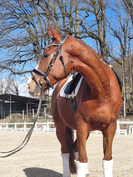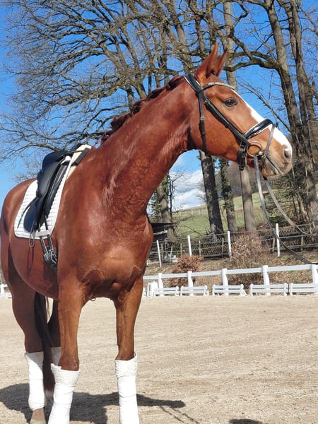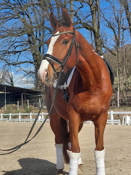 Double-registered 5-year-old chestnut gelding by Samarant x Damaggio 174 cm A charming and easy-to-ride model student with excellent basic gaits, seeking his favorite human. Completely straightforward in handling and riding in the indoor arena, on the outdoor ring, and in the field. Absolutely compatible with other horses. This handsome chestnut impresses with his calm, well-balanced canter, very good free jumping, and excellent work attitude. Ideal for ambitious leisure riders or competitive riders. Successful chip operation performed before starting under saddle. Good TÜV inspection. Price negotiable