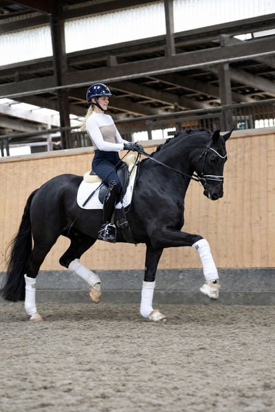 Te koop staat de karaktervolle en indrukwekkende ruin Riovaldi. Begin 2024 werd hij voorgesteld tijdens de Oldenburg-keuring in Vechta en kreeg daar een positief keuringsrapport. Vervolgens werd hij op driejarige leeftijd gecastreerd en geniet sindsdien van een fantastisch leven als rijpaard. Riovaldi overtuigt met drie uitstekende basisgangen, een prachtig uiterlijk in een donkere coat en veel kwaliteit onder het zadel. Momenteel wordt hij voorzichtig voorbereid op L-niveau dressuurproeven, zoals buitenwaarts galopperen, galop-voetswisselingen, stap-galop-overgangen en korte volte-aanzetten, die al veilig aangelegd zijn. Daarnaast toont hij opmerkelijk talent voor piaffe en passage en brengt zijn ruiter dagelijks grote vreugde. In de omgang is hij gemakkelijk, vriendelijk en nervensterk, zowel in de dagelijkse handling als in de kudde. Ook van moederskant is hij zeer interessant gefokt: Zijn moeder Venecia OLD was vice-Bundeschampioness en behaalde successen tot Inter I-niveau. Geen e-mailvragen, graag alleen telefonisch contact. Gaven zonder garantie. Prijs exclusief BTW.