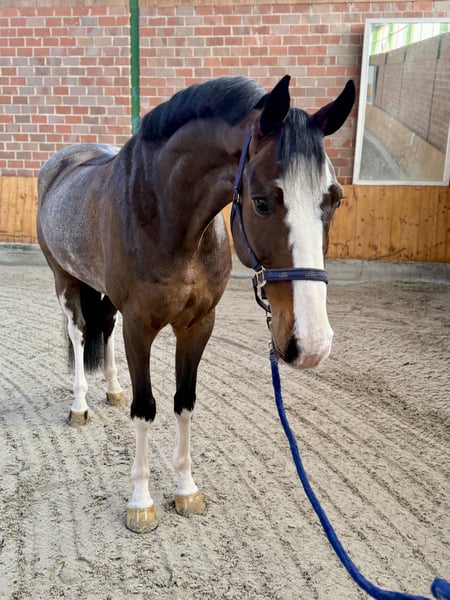 Zum Verkauf steht dieser 7 jährige Wallach mit Top Abstammung. Er kann Platzierungen bis 125cm nachweisen und ist 168cm groß. Er will immer auf die andere Seite und zeigt beim Springen genug Potenzial für den großen Sport. Dressurmäßig und im Handling auch super unkompliziert und einfach. Springt leicht die fliegenden Wechsel und ist auch im Umgang ein absoluter Schatz. Er ist ein Pferd was allerdings ordentlich Blut hat also keine Schlaftablette. Aktueller Tüv vorhanden. Platz vor Preis
