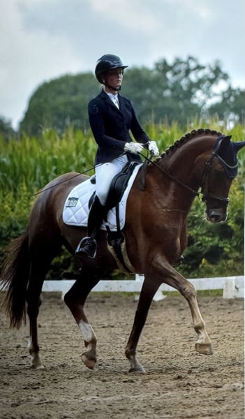 Darcey ist ein sehr gut ausgebildetes und talentiertes Dressurpferd und ist sehr leicht zu reiten. Er hat bereits L-Dressur gewonnen und in seiner ersten Turniersaison mit seiner jugendlichen Reiterin schöne Erfolge erreicht. Auch im Springen zeigt er viel Freude und Talent. Er guckt nicht, zieht gut zum Sprung und geht souverän einen Parcours. Im Gelände und auf dem Geländeplatz ist er brav, zuverlässig und lässt sich jederzeit gut handeln. Vom Charakter her ist er sehr menschenbezogen, freundlich und unkompliziert. Er ist in seiner Wallachgruppe absolut verträglich und kommt auch mit Stuten gut zurecht. Darcey wurde als Oldenburger gekört, später jedoch als Sportpferd kastriert. Aufgrund eines Mangels, der seine Nutzung als Sportpferd nicht beeinträchtigt, wird er unter Wert abgegeben. Wir wünschen uns jemanden der Darcey Abwechslung bietet und ihn weiter fördert. Er hat einen tollen Charakter, ist schmiede- und verladefromm und regelmäßig geimpft, entwurmt und gerade beim Zahnarzt gewesen. Röntgenbilder inklusive Hals und Genick ohne Befund vorhanden. Wenn Sie Interesse haben melden Sie sich gerne unter 0172-54 86 008 Videos und weitere Infos gerne per WhatsApp.