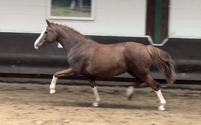 Mooie, kleurrijke, 4x hoog witte, dubbel geplaatste merrie, drachtig voor 2025 van de al even kleurrijke dubbelvererver, kampioenshengst en HLP winnaar Cafe au lait, die al enkele jaren de aandacht trekt met zijn ongelooflijk succesvolle nakomelingen in de dressuur- en springsport op gevorderd niveau. Ze verwacht volgend jaar ook een veulen via embryotransplantatie van de onlangs goedgekeurde Cafe au lait nakomeling "Cafe's Don Rubin"! Beide hengsten zijn homozygoot donker, er kan geen vosje vallen. De jongere volle broer van de merrie is al succesvol op medium dressuurniveau en andere broers en zussen van dezelfde moeder zijn succesvol op gevorderd dressuurniveau. Ze was zelf reservekampioen op de veulenkampioenschappen en is extreem sterk in beweging! Staat in hengstenmodel, met veel hals en een vlekkeloze bovenlijn! Cafe au lait kan schitteren met een aantal dubbel getalenteerde nakomelingen: Cafe's "Casimir" (Cafe au lait x Calido x Grannus) was de gevierde hoofdprijswinnaar op de Oldenburg Elite Auction, was op jonge leeftijd al seriewinnaar bij de medium (M) dressuurpaarden en was als 7-jarige opnieuw seriewinnaar bij zijn eerste dressuurwedstrijden op gevorderd (S) niveau! Hij zegeviert nu in internationale Intermediaire I klassen. Kasselmann's merrie Cafe's Caletta (Cafe au lait x Calato) heeft ook al dressuurwedstrijden op gevorderd (S) niveau en internationale Grand Prix gewonnen. Cafe's Matts (Cafe au lait x Don Frederico) was het op één na duurste dressuurpaard op de Oldenburger Summer Mixed Sales. Andere jonge paarden uit springgeörienteerde fokmerries hebben zich al meerdere keren geplaatst in proeven voor jonge dressuurpaarden op gevorderd (A) tot middelbaar (M) niveau en zijn opvallend sterk bewegend en helder van geest. Het lijdt geen twijfel dat de Cafe au lait nakomelingen overtuigen in de springsport tot op gevorderd niveau. De gekeurde Cafe's Champus was Vice Wereldkampioen jonge paarden onder Rene Tebbel en staat ook bij ons ter dekking. Ook gekeurd en uit ons fokprogramma: Cafe Junior (Cafe au lait x Silvio I), internationaal geplaatst in springwedstrijden op gevorderd (S*) niveau, Cafe's Columbo (Cafe au lait x Belstaff), succesvol in Frankrijk. Cafe au lait zelf was finalist in het Bundeschampionat onder Philipp Weishaupt en is succesvol geweest tot en met gevorderd (S***) niveau in de springsport, maar heeft ook drie spectaculaire gangen en is opgeleid tot en met gevorderd (S) niveau in de dressuursport. Hij is gestationeerd bij Paul Schockemöhle en heeft al een aantal internationaal succesvolle springpaarden gebracht, waaronder "Royce", die de FEI CSI5* $500,000 Rolex Grand Prix Wellington won. Onze veulens krijgen dagelijks mineraalvoer en veulenstarter, regelmatig EQUISTRO Haemolytan en Ipaligo Foal, ontwormen en een hoefsmid zijn ook vanzelfsprekend. De moederdieren krijgen ook speciaal merrievoer tijdens de dracht, dagelijks sapvoer en lijnzaadolie, en hooi ad libitum. Dit zorgt ervoor dat onze nakomelingen altijd in optimale gezondheid verkeren! Meer veulens en nakomelingen uit ons eigen fokprogramma op aanvraag. Sommige zijn te vinden onder de andere advertenties. Elk jaar hebben we ongeveer 20 veulens van Cafe au lait en Cafe's Don Rubin. Video aanvragen etc. vooraf alleen mogelijk via Whats App.