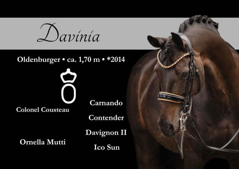 Dear interested parties, I am happy to send videos via WhatsApp at 00491713438949. For appointment arrangements for trial rides, please send me a WhatsApp. For further questions, I am available during the day via WhatsApp, and you can reach me best by phone between 4 PM and 7 PM. I look forward to hearing from you. ⚜️Davinia⚜️ Age: 11 years (2014) Height: approx. 1.69 m Lineage: Colonel Cousteau x Davignon II Training level: Successful in A and L level competitions with scores up to 8.7 Vet check: Good older X-rays available Beautiful dark brown mare with a top character and impressive quality. This dream mare impresses not only with her stunning appearance but also with her excellent quality under saddle and her exemplary character. She is highly successful in dressage tests at the A and L levels – with scores up to 8.7! – and always shows herself to be willing and motivated. Due to her reliability and uncomplicated nature, she is pleasant to ride and is perfectly suited for ambitious amateurs from A level. She always wants to please, enjoys working, and captivates with an impressive presence that makes her a real eye-catcher – both at competitions and in everyday life. The mare masters the exercises of the M level and has a lot of potential for this area. Even outside the arena, she shows confidence: she is familiar with trail rides, is strong-nerved, and very social with other horses. Whether for adults, well-riding teenagers, or talented children – this horse is a real find for anyone looking for an honest, performance-oriented, and reliable riding horse. A well-rounded package for everyone who wants to ride with joy. ⚜️Tel: 0171-3438949 ⚜️a.devittorio@web.de ⚜️https://www.ehorses.de/angelinadevittorio Facebook and Instagram Angelina De Vittorio