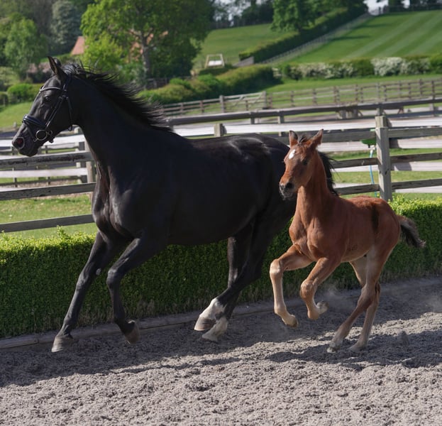 MSJ Tia Nova is a stunning black experienced broodmare out of the Rudilore dam line (closely related to world no 1 dressage stallion Rubin Royal), then from Negro x Donnerhall, she is from some of the best classic dressage lines of all time. Nova is an active mover and stunning type, she is a kind character to handle and was a lovely mare to ride before she went into breeding. She has been an easy breeder & lovely mum many times now and passes on super character and movement to her offspring including 1 being sold to a multi Olympic rider, we have high hopes for a few of them including this years super Vitalos colt which is being retained, along with other older siblings to continue this line of super riding horses. Nova is available on weaning of her current foal, but in the meantime at the buyers cost for the vet & semen is available to re breed with the stallion of your choice. Easy in a herd and for handling, making her suitable for a range of new homes, including a less experienced or new breeder too, but also would equally be a super addition into a professional stud too.