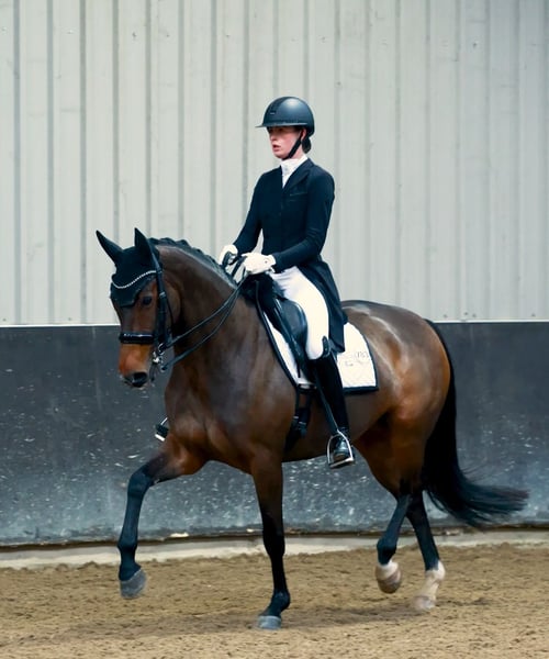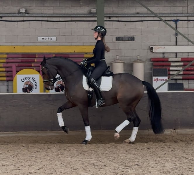 For sale: a wonderfully sweet mare with experience, quality, and a golden temperament We are pleased to offer this exceptionally gentle and affectionate mare for sale. A horse that stands out for her friendly nature, honesty, and versatility—both in sport and beyond. This mare has extensive competition experience. She is light and sensitive to ride, responds to very subtle aids, and is sharp without becoming hot or spooky. She gives her rider a wonderful feeling and remains consistently willing. Under saddle, she has an excellent walk, beautiful extended gaits, and easy changes. She performs flying changes effortlessly. In training, she already shows a correct and promising start of piaffe and passage. She also jumps a few small fences. In the arena, she always puts in her best effort and works with enthusiasm. She performs all exercises with great ease. In short, she is a very nice competition horse. She can be ridden both on snaffle and double bridle. Outside of dressage, she is also a very pleasant horse. She enjoys jumping, and in training, we occasionally do courses up to 1.00 m for variety. Additionally, she visibly enjoys forest and beach rides, which we do weekly, as well as relaxed walks in the woods on a lead. She is so trustworthy in handling that even a small child can walk safely with her. Incognito is very human-oriented, which strengthens the bond between horse and rider. She is very easy to handle: she is calm at the farrier, dentist, and during transport. Her temperament is calm, sensible, and free of panic. She always loves cuddles and scratches. She is in excellent health. In August 2024, she will undergo a full clinical and radiological examination, including neck and back, with no remarks. Incognito has no stable vices. We are looking for a very loving and suitable home where she will have all the opportunities in sport and receive proper attention. Please feel free to contact us by phone for more information or to arrange a meeting.
