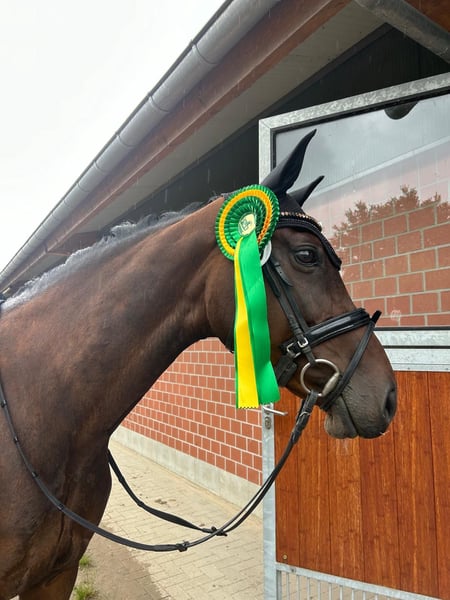 Schweren Herzens verkaufen wir unsere 13-jährige Oldenburger Stute „Coco“ hat ein Stockmaß von 1,64 cm, eine echte Allrounderin und für jeden Spaß zu haben. Wir wünschen uns für sie einen absoluten Bestplatz wo sie als vollwertiges Familienmitglied geschätzt und behandelt wird. Wir wünschen uns für sie ein Zuhause, in dem sie einem ambitionierten Freizeitreiter oder als Lehrmeisterin Freude bereiten kann – mit gelegentlichen Turnierambitionen. Der Springsport ist Cocos Leidenschaft, wurde in den letzten Jahren aufgrund mangelnden Interesses jedoch nur auf E-A-Niveau verfolgt. Aufgrund ihrer Freude am Springen und ihres Charakters können wir sie uns hier als tolle Lehrmeisterin vorstellen. Dressurmäßig konnte sich Coco noch in diesem Jahr in Dressurprüfungen der Klasse A* platzieren mit tollen Noten bis 7,4. Spielerisch wurden in das Training immer mal wieder diverse Seitengänge und fliegende Wechsel eingebaut. Auch in einer geführten Gelassenheitsprüfung konnte sich Coco in diesem Jahr an erster Stelle platzieren. Sie freut sich über Ausritte (hier allerdings nur zu zweit, alleine arbeiten wir dran), Bodenarbeit, ein paar Geländesprünge, Wasser oder Longen-Programm. Seit wir sie haben, tritt Coco im Schritt am aufgenommenen Zügel kurz-lang, was sie jedoch nicht negativ beeinträchtigt und mit guter reiterlicher Unterstützung gut „rausgeritten“ werden kann. Auch in den Dressurprotokollen wurde der Schritt nie als taktunrein bewertet. Außerdem hat Coco leichte Arthrose in der HWS, welches wir im vergangenen Jahr haben spritzen lassen und welches sie nicht weiter einschränkt. Wir wünschen uns für Coco einen liebevollen aber erfahrenen und konsequenten Reiter. Sie ist im Umgang ein absoluter Schatz und hat sich insbesondere dieses Jahr auf Turnier von ihrer besten und souveränen Seite gezeigt. Im Gelände kann es allerdings vorkommen, dass man sich durchsetzen muss, wenn Madame den Heimweg antreten möchte. Coco ist regelmäßig entwurmt, turniergemäß geimpft (+West-Nil), hat 2 Eisen und ist verladefromm. Aktuell steht sie nachts in der Box und tagsüber auf der Stuten-Wiese. Vorher stand sie im Sommer auf einer 24 Stunden Wiese in einer gemischten Herde und kam dort auch super zurecht. Sie ist sehr verträglich. Alles in allem ist Coco eine tolle Stute, die sich in der Vergangenheit unter starken Reitern toll gezeigt hat aber auch schwächeren Reitern mit ihrer Ehrlichkeit vieles beibringen konnte. Können sie uns aber durch ihre Abstimmung auch als Zuchtstute oder durch ihre verträgliche Art als Beistellpferd vorstellen. Wir verkaufen sie schweren Herzens, da sich mit Anfang 20 die Lebensumstände geändert haben. Absolut Platz vor Preis!