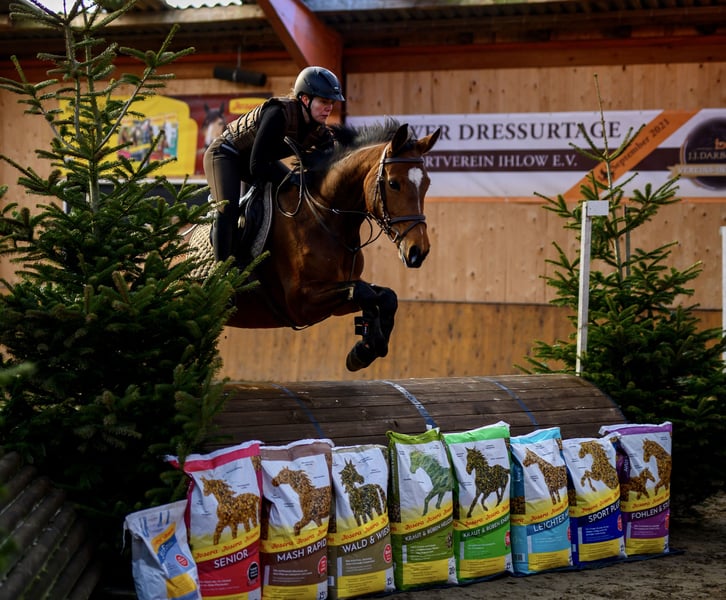 Landia is a completely unspoiled and highly ambitious mare. She is easy to ride and therefore suitable for young riders. We bred, trained, and competed her ourselves up to A** level, achieving numerous wins. Landia has a strong jumping instinct and always aims for the other side; she has plenty of go but is easy to handle. In recent years, she has had three foals. She has been back in training this year, but due to professional commitments, I am no longer able to give her the time she deserves. She is in excellent condition, as she always has been, with fine legs (no signs of splints or similar issues), and she has never experienced colic, coughing, or other health problems. Price is negotiable for the right home.