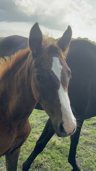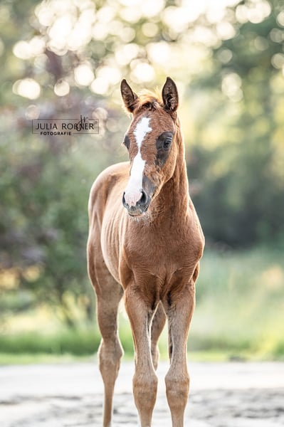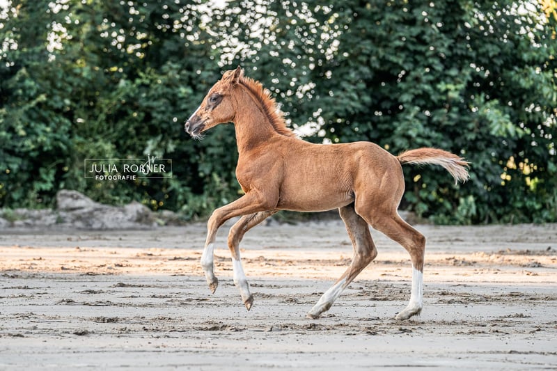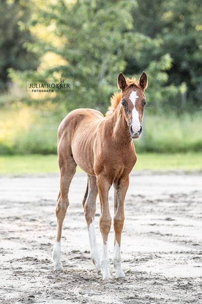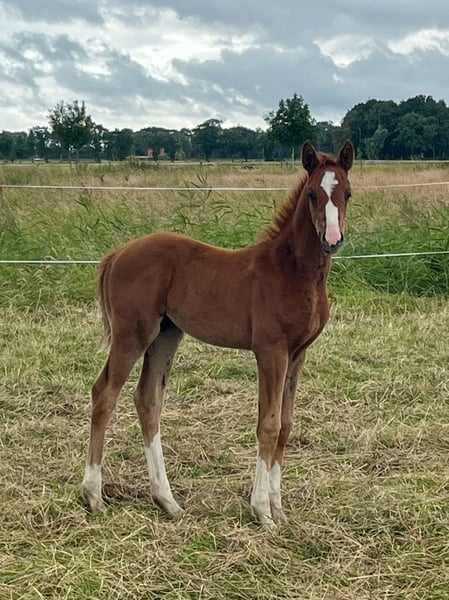 For sale is a typy colorful chestnut mare from the year 2024, sired by the successful Landstallion Ben Benicio (Benicio x Fidermark x Hochadel), who has achieved success up to Inter 1. He was awarded as a premium stallion at his licensing and has already produced successful offspring in sport. He also has several licensed sons to his credit. The mare impresses with her beautiful colorful chestnut coat, just like Benicio himself, as well as her three excellent basic gaits. Her dam comes from a well-maintained and bloodline-strong Oldenburg mare line that has been cultivated for decades. Emphasis has been placed on performance and very good conformation. Her maternal grandfather Devonport was the Bundeschampion in 2017 and is now successful at Grand Prix level. The lineage further traces back to London Lightning and the prominent sires Diamond Hit and Rubinstein I. Successful sport horses from this mare line include the international Grand Prix horses Doktor/Shelly Francis (USA) and Rubel/Fanny Verliefden (Belgium).
