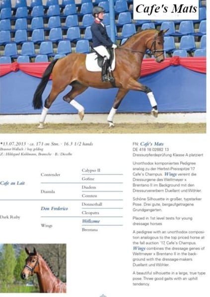 Klejnot hodowlany z najlepszym rodowodem, z przekonującymi klaczkami pieszo (patrz inne ogłoszenia) i ponownie w ciąży na 2024 rok przez czempiona ogiera Cafe au lait! Kolejna pełna siostra tego krycia została już sprzedana, pełny brat (kandydat na ogiera) można jeszcze odwiedzić na miejscu. Pełny brat tej klaczy odnosił sukcesy w ujeżdżeniu do S**! Nawet w kryciu z Haflingerem wyprodukował niesamowicie silne potomstwo (patrz zdjęcia). Ojciec "De Kooning" dostarczył już konie Grand Prix, takie jak Dalou Shan, pomimo dość ograniczonego wykorzystania stadniny i, jako bezpośredni syn wyjątkowego Donnerhalla, ma dużo krwi holsztyńskiej po stronie matki. Pomimo niewielkiej liczby potomstwa, wydał już kilka licencjonowanych potomstwa, w tym ogiera premium w Neustadt Dosse, zwycięzcę ujeżdżenia w Monachium-Riem i kolejnego ogiera premium! "Cafe au lait", zwycięzca licencji, zwycięzca HLP i finalista, zyskał sławę w ostatnich latach dzięki swojemu niezwykle utytułowanemu potomstwu w ujeżdżeniu i skokach przez przeszkody zarówno w klasie ciężkiej. W ten sposób Cafe's Casimir" (Cafe au lait x Calido x Grannus) stał się słynną główną nagrodą Oldenburg Elite Auction, jest już seryjnym zwycięzcą w S-ujeżdżeniu i międzynarodowym Intermediaire I triumfował w młodym wieku. Kawiarnia Mare Kasselmann's Caletta (Cafe au lait x Calato) również zajęła już miejsce w ujeżdżeniu S i wygrała Międzynarodowe Grand Prix. Maty kawiarniane (Cafe au lait x Don Frederico) stały się drugim najdroższym koniem ujeżdżeniowym Letniej Sprzedaży Mieszanej w Oldenburgu. Inne młode konie z klaczy skaczących matek już kilkakrotnie brały udział w testach koni ujeżdżeniowych A i L i są niezwykle silne w ruchu i czyste jak głowa. Nie ma wątpliwości, że potomstwo café au lait przekonuje w skokach przez przeszkody do klasy zaawansowanej (np. z naszej hodowli Cafe's Champus: licencjonowany, wicemistrz świata młodych koni, Cafe Junior: licencjonowany, międzynarodowy sukces w Arabii Saudyjskiej). Stacjonując z Paulem Schockemöhle, Cafe au lait wyprodukowała już kilku międzynarodowych skoczków, w tym "Royce'a", zwycięzcę FEI CSI5* $500,000 Rolex Grand Prix Wellington. Sam Cafe au lait był finalistą Mistrzostw Krajowych pod Philippem Weishauptem i odnosił sukcesy aż do skoków S***, ale został również wyposażony w trzy spektakularne GGA i trenował ujeżdżenie na poziomie S. Cafe au lait jest homozygotyczna ciemna, więc żaden lis nie może spaść. Nasze źrebięta otrzymują codziennie paszę mineralną, a źrebięta są również przystawkami, regularne EQUISTRO Haemolytan i Ipaligo Foal, odrobaczanie i kowalstwo są oczywiście również oczywistością. Matki otrzymują również specjalną karmę dla klaczy przez cały okres ciąży, codzienną paszę dla soku i olej lniany, a także siano ad libitum. Tak więc nasze potomstwo jest zawsze w najlepszym stanie zdrowia! Istnieją również ciężarne klacze hodowlane na sprzedaż, z których niektóre można znaleźć pod innymi ogłoszeniami. Jeśli rodowód jest odpowiedni, możliwa jest wymiana klaczy hodowlanych.