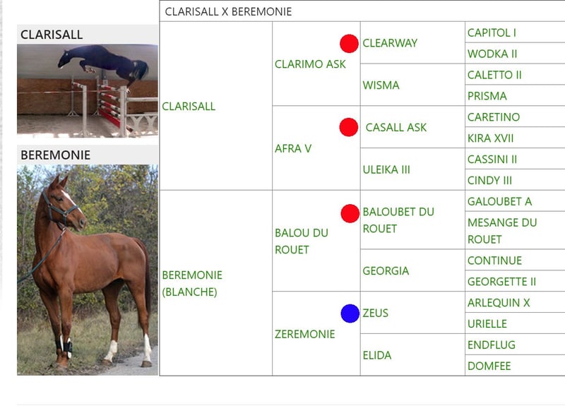 I offer a mare by Balou du Rouet x Zeus plus a paiette for ICSI by Chacco Blue II: https://www.horsetelex.com/horses/pedigree/1859974/bazenia She bears a striking resemblance to her grandfather Baloubet du Rouet! I am looking for a breeder who lives near an insemination center to become my partner and, without buying the mare, receive a fertilized embryo to transfer to his mare in exchange for assistance! The first descendant of Blanche by Eldorado jumps in the high class: https://www.horsetelex.com/horses/pedigree/1859977/greenday The last one, which is by Clarisall (Clarimo-Casall Ask-Cassini II), also shows impressive jumping qualities!